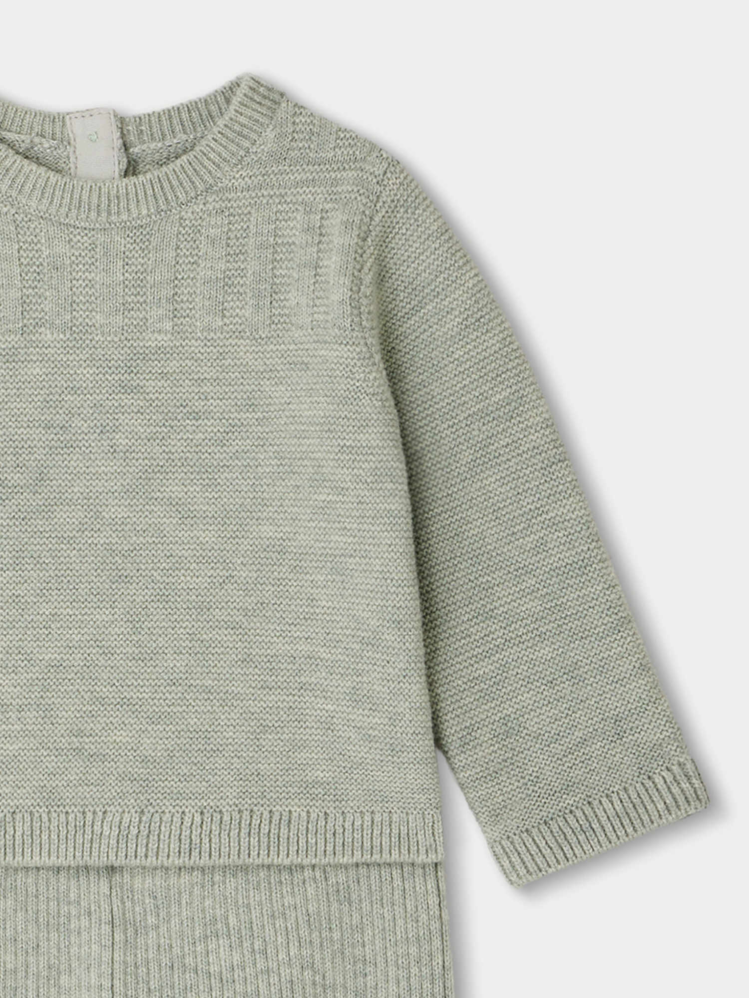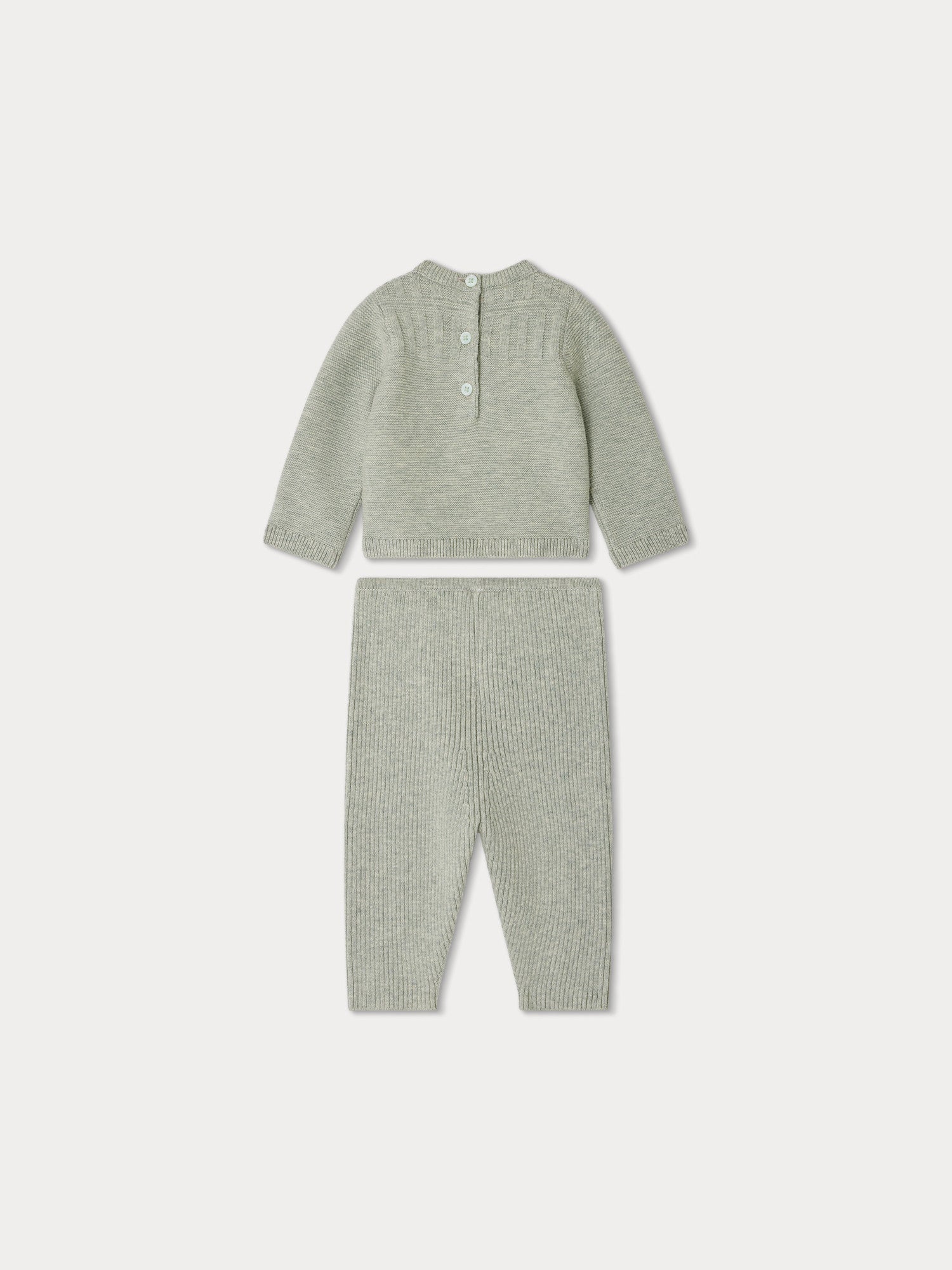 This Gavin ensemble for babies features a variety of decorative stitches. The set is made from a wool and cotton blend, and composed of a long-sleeved top and ribbed pants.