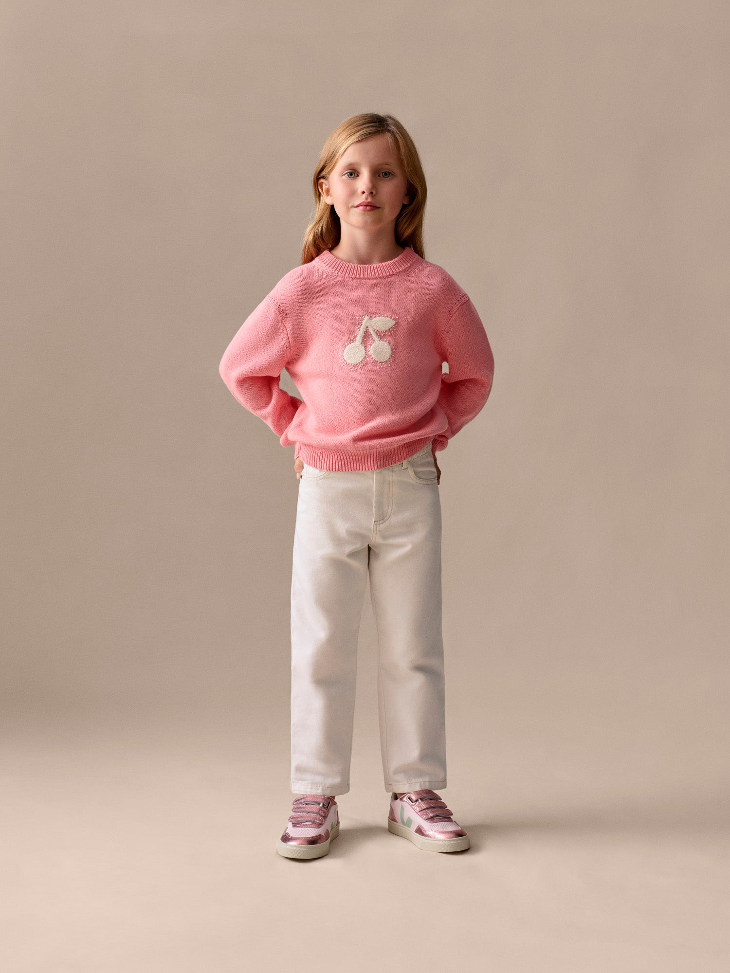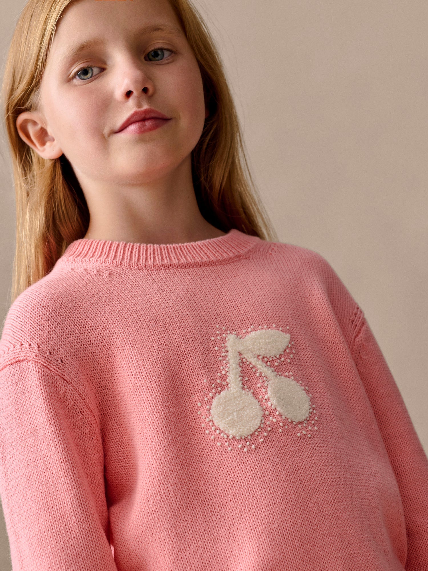 The Liesel sweater for girls is sure to turn a few heads with its large, contrasting, hand-embroidered cherry on the front. This cotton design features dropped shoulders with knitted detail.