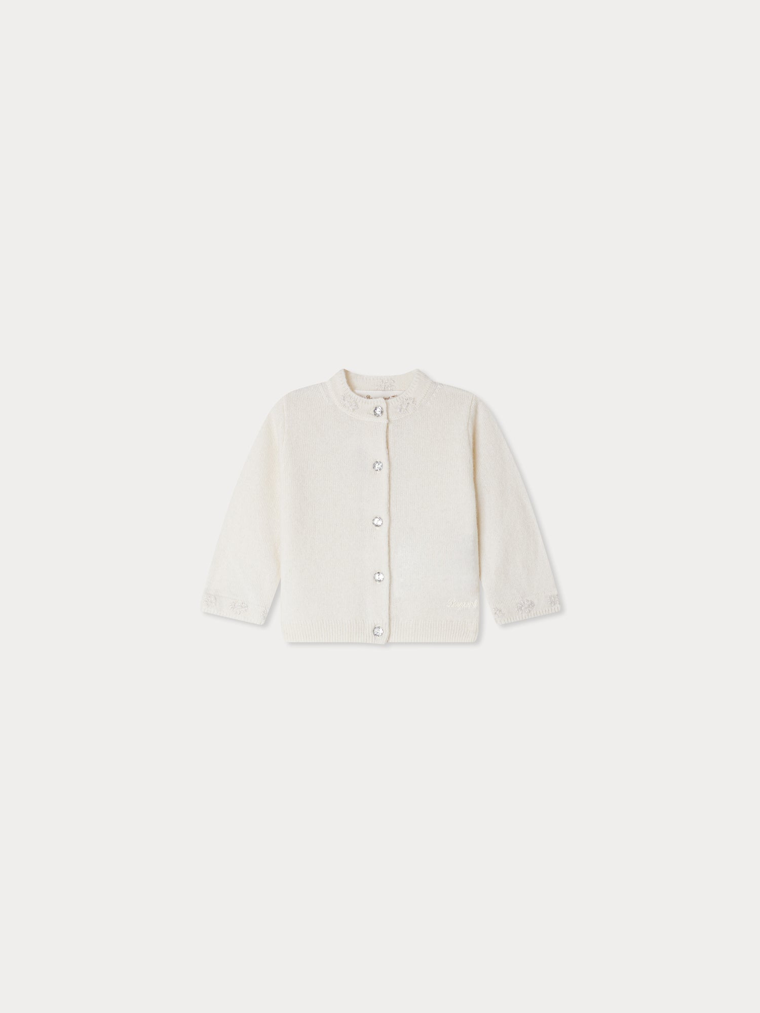 This Teyana cardigan for baby, made in the softest cashmere, exemplifies sophistication. Delicate, hand-embroidered flowers embellish the stand-up collar and cuffs. The charming beaded buttons make it the perfect piece for a special occasion. The House of Bonpoint's tone-on-tone signature adorns the front hem.