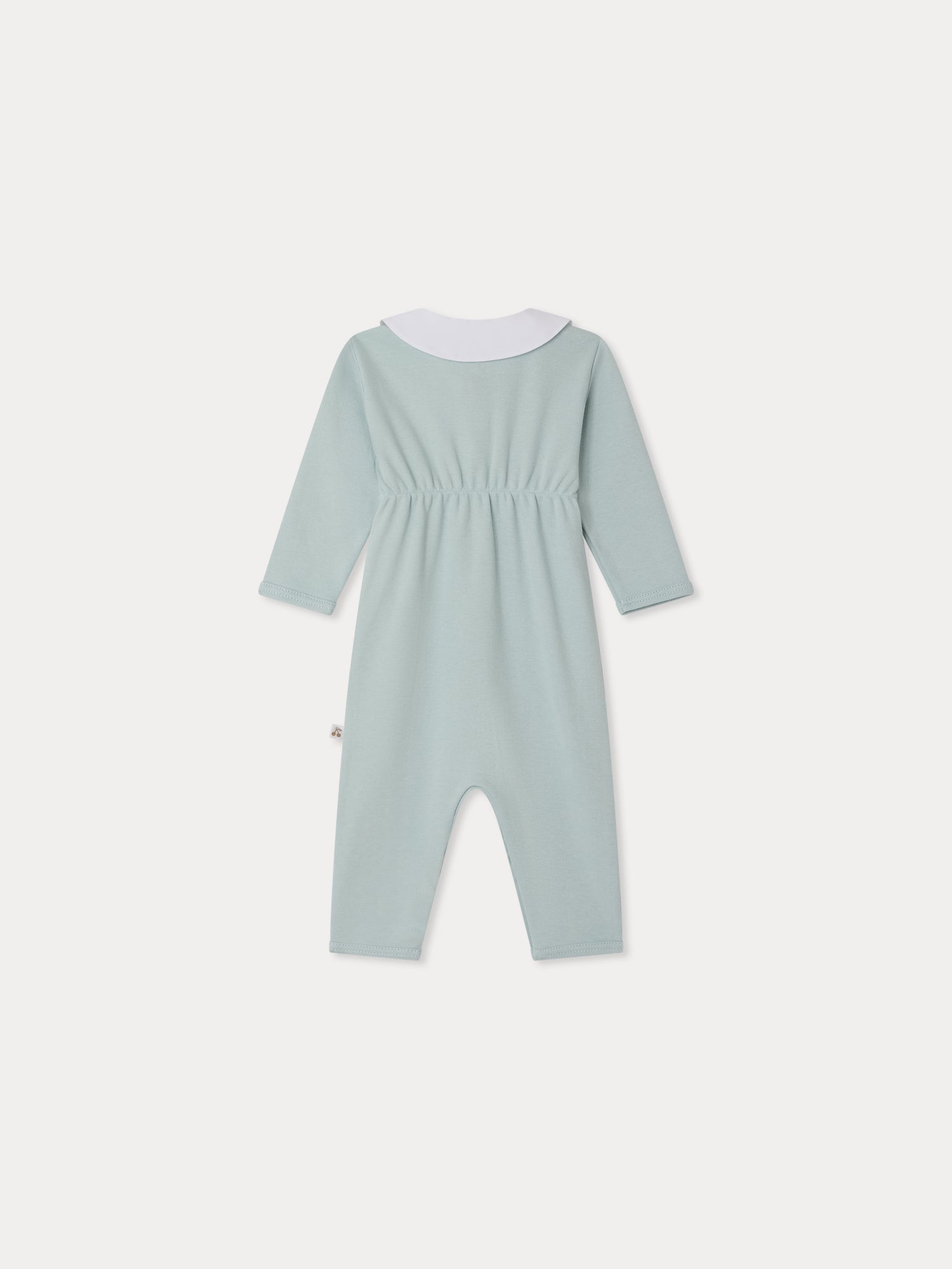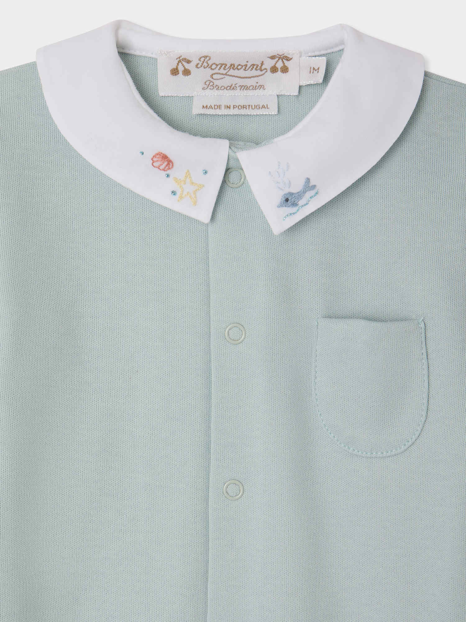 The Anton pajamas for babies are truly delightful with their contrasting hand-embroidered collar boasting an underwater theme. This comfortable design in an interlock knit has a patch pocket on the chest.