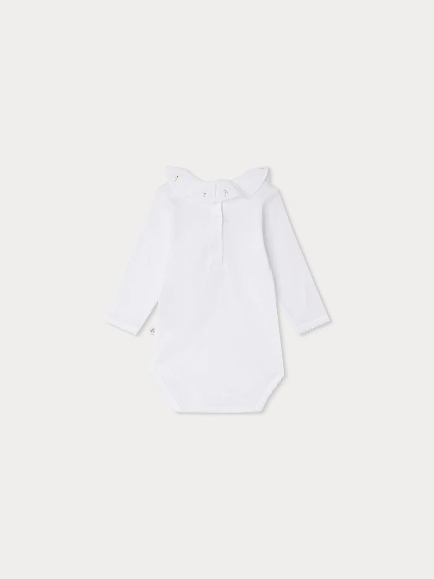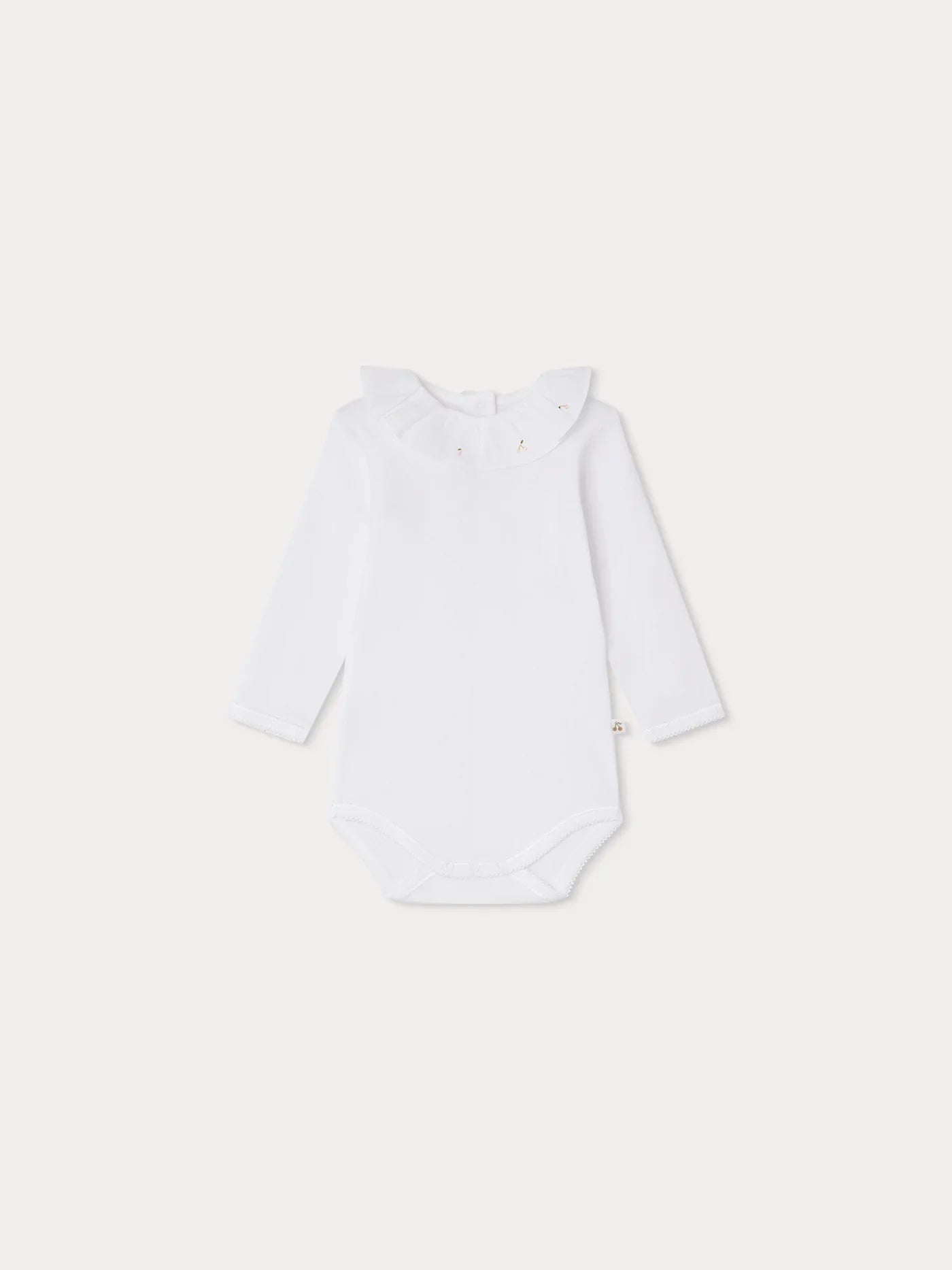 The April babies' onesie has a distinctive collar decorated with hand-embroidered cherries. The cotton design fastens with discreet snap buttons at the back and between the legs.