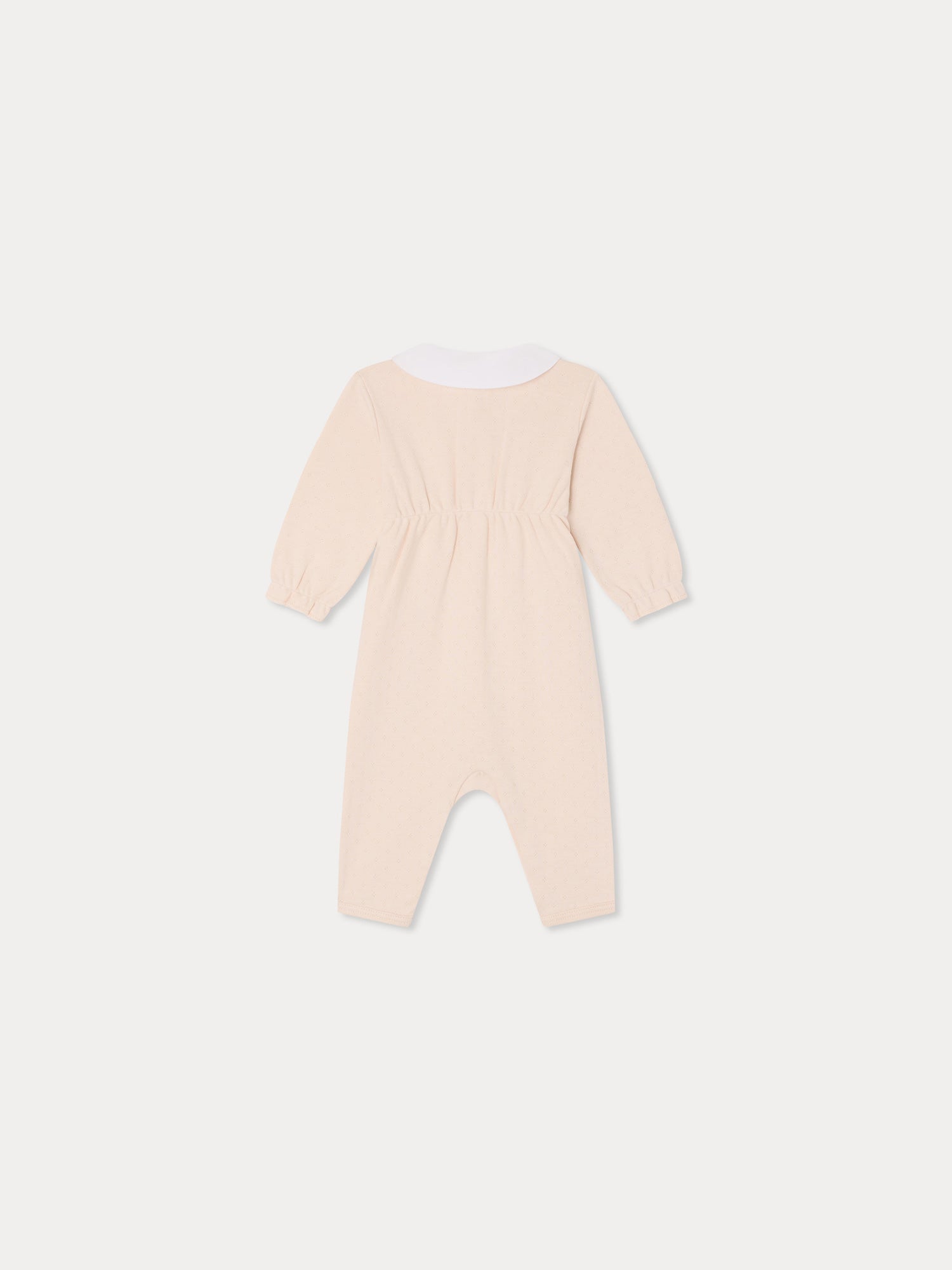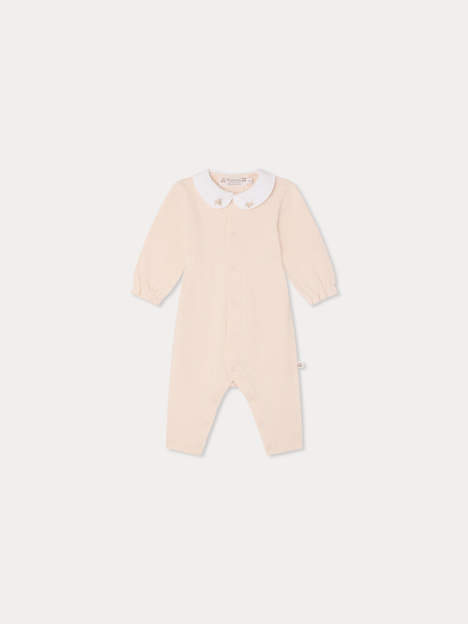 These Cayla pajamas for babies are made from organic cotton in a 1x1 rib stitch, featuring allover pointelle detail. The contrasting Peter Pan collar is delicately embroidered with a bunny and ribbon.