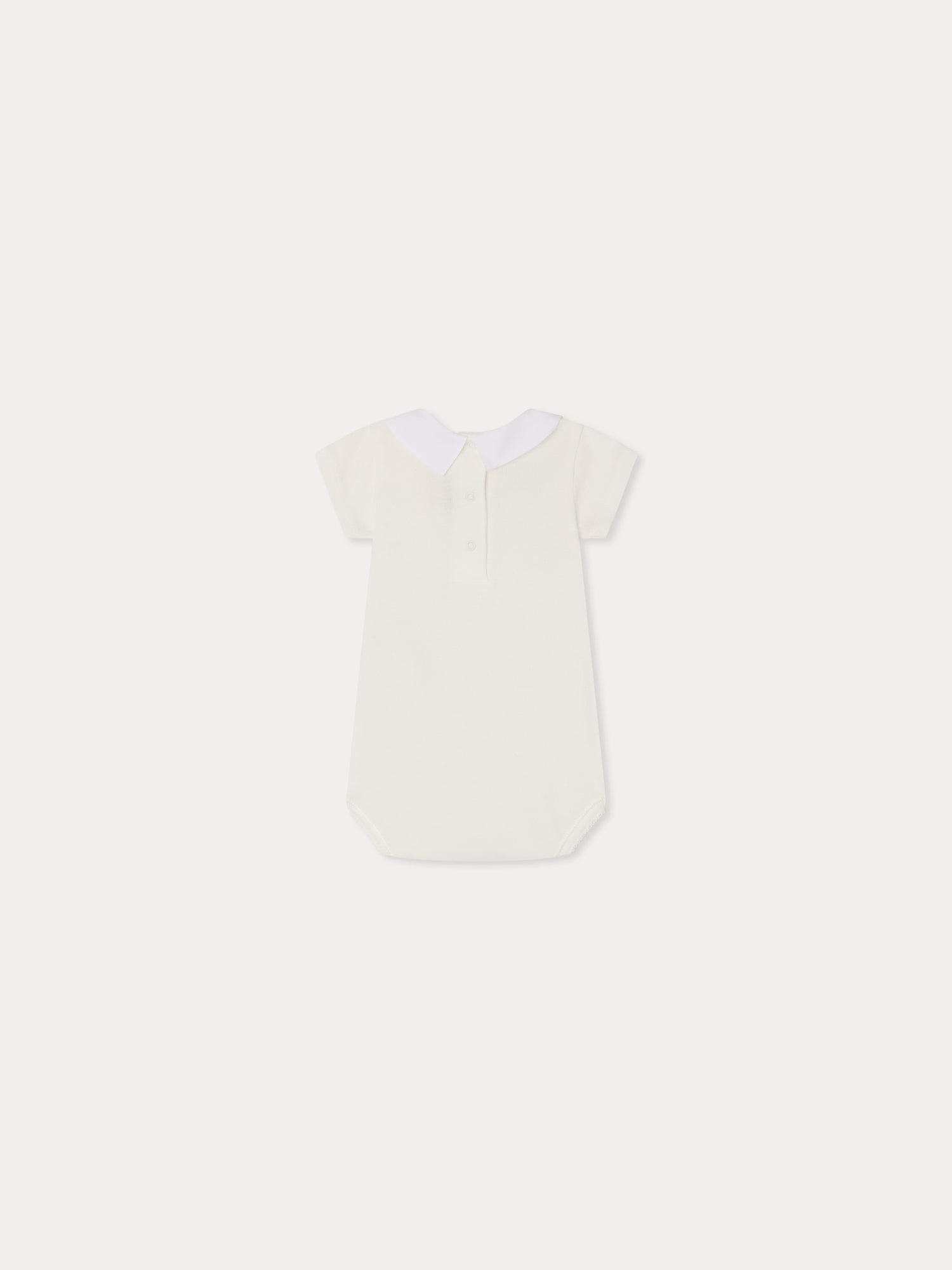 This Juillet onesie for babies features a charming shirt collar adorned with a hand-embroidered car and palm tree. It is made from organic cotton.