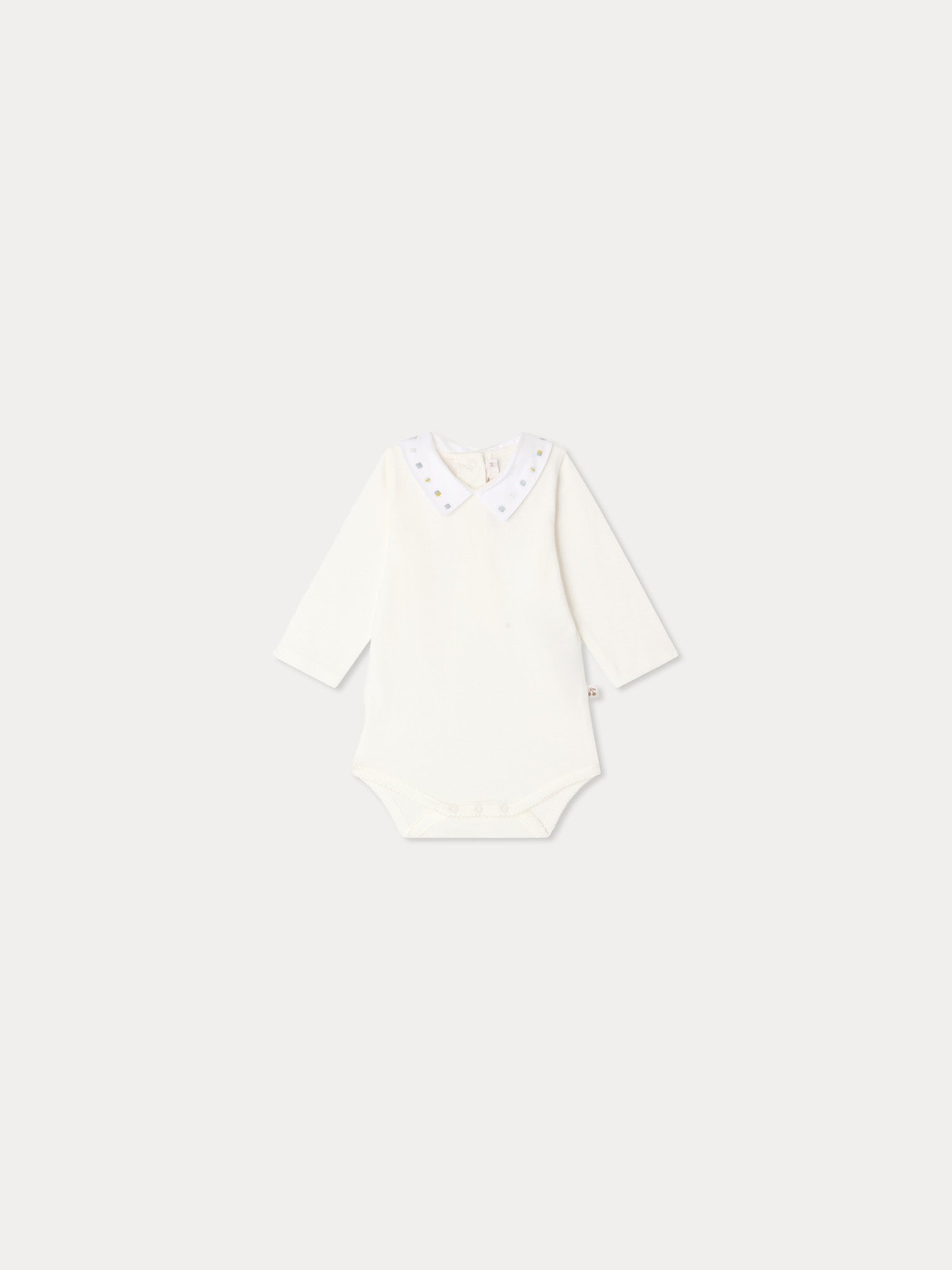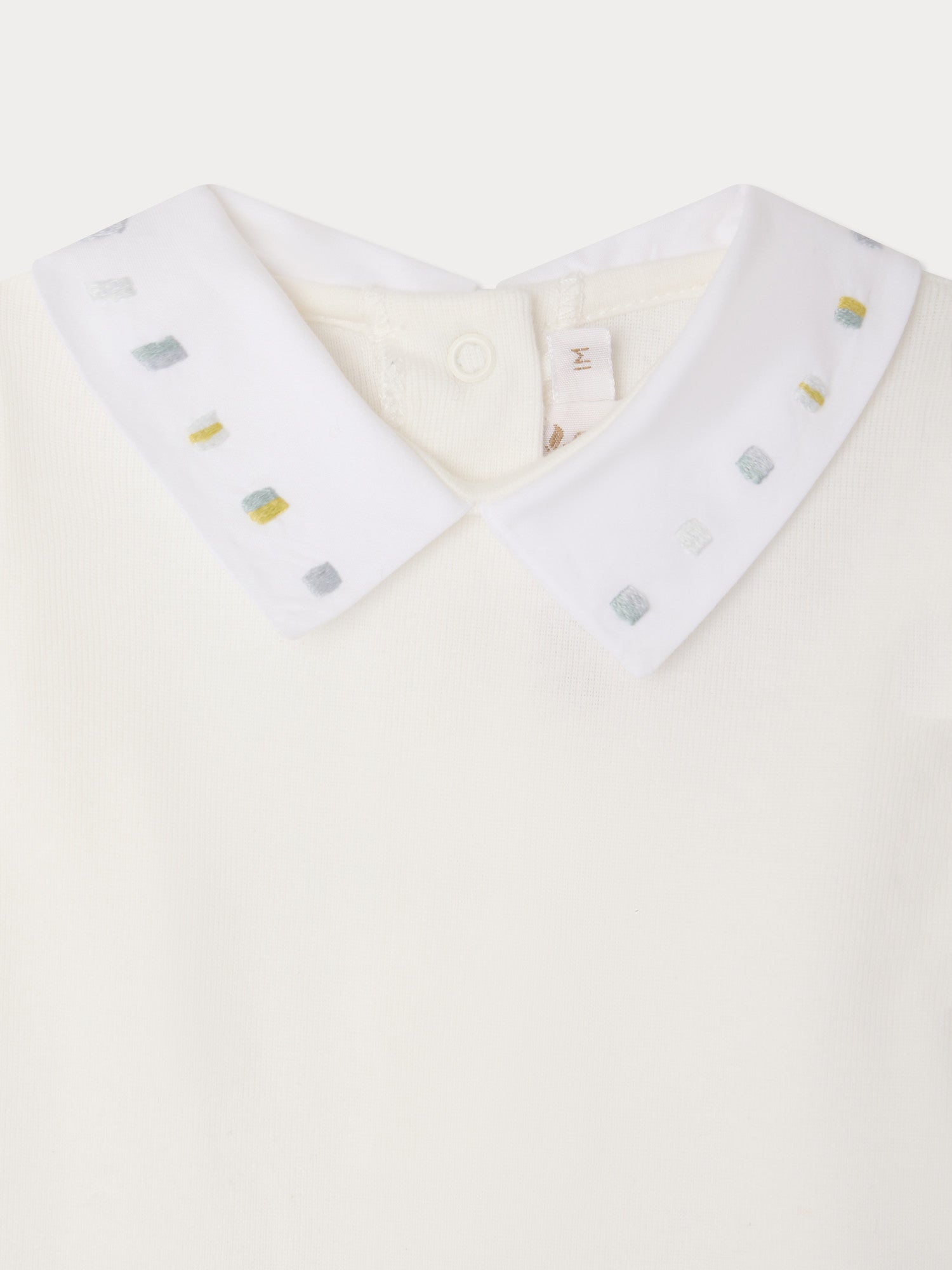 This Juillet baby onesie features a modern hand-embroidered check motif on the collar. The organic cotton design has snap-button fasteners at the back and between the legs.