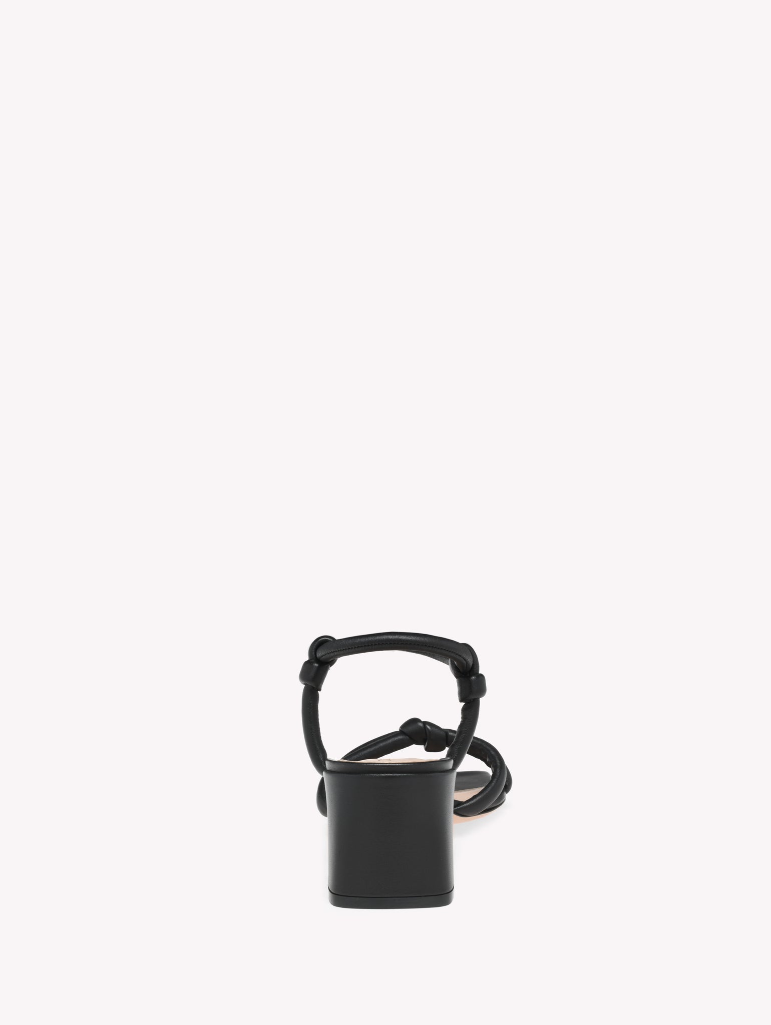 Juno 55 is a squared-toe sandal with a 55mm block heel. Crafted from leather, this style features soft tubular upper straps with knotted details. The round tubular elastic ankle strap covered in leather ensures easy wearability. Handmade in Italy. Composition: 100% NAPPA Heel Height: 2.2 inches / 55 mm