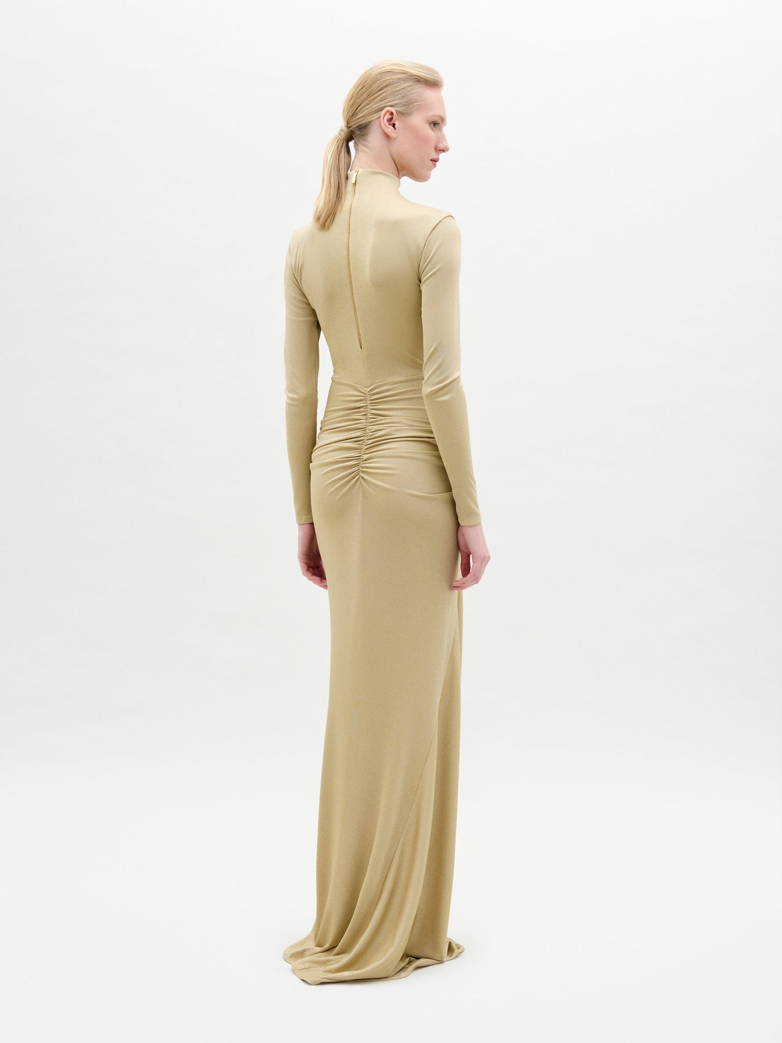 A woman wearing the Celinda Dress in color Gold  on a white background