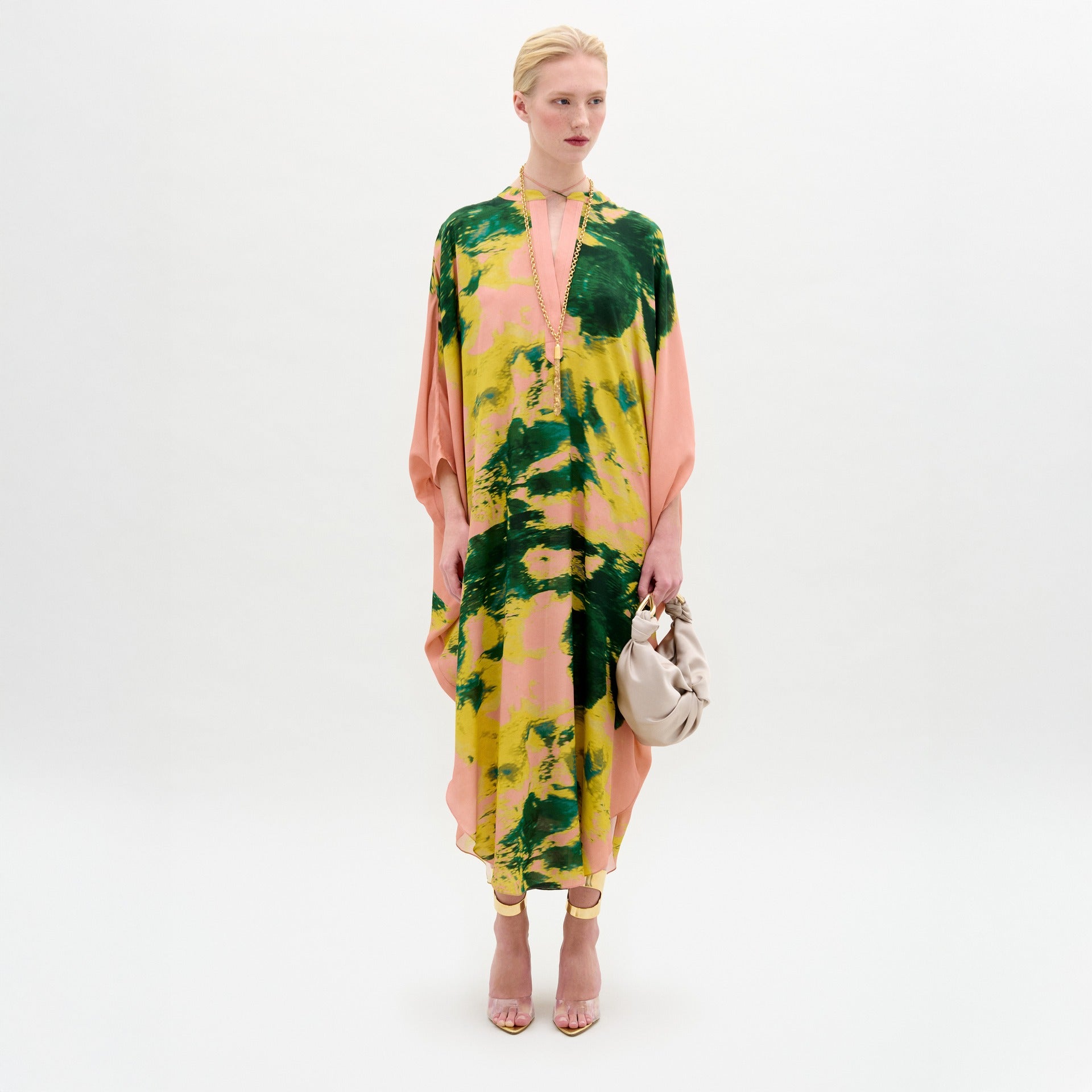 A woman stands against a white background wearing the Elea Tunic, an oversized 100% silk maxi dress with pink, yellow, and green patterns, paired with a beige bag and strappy heels.