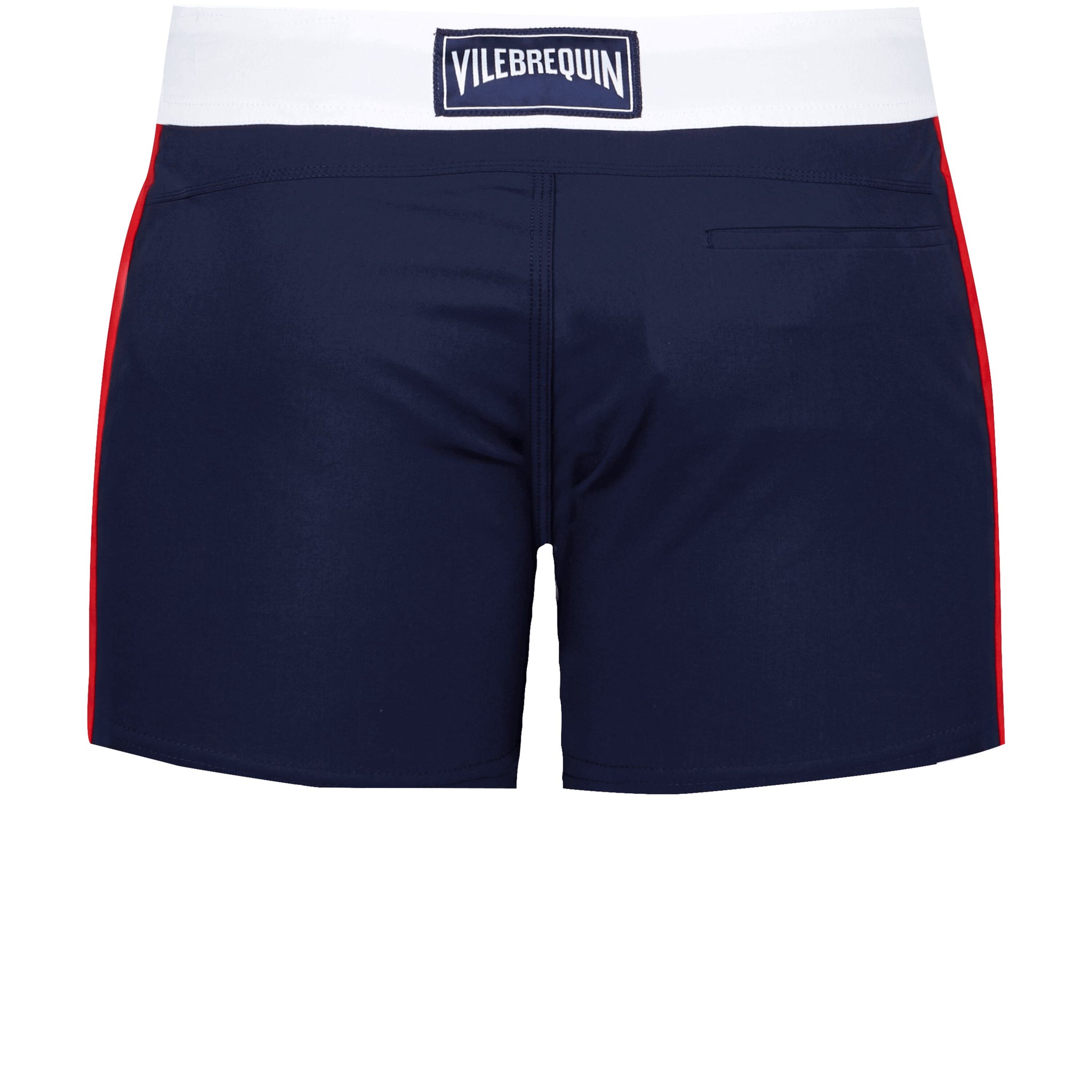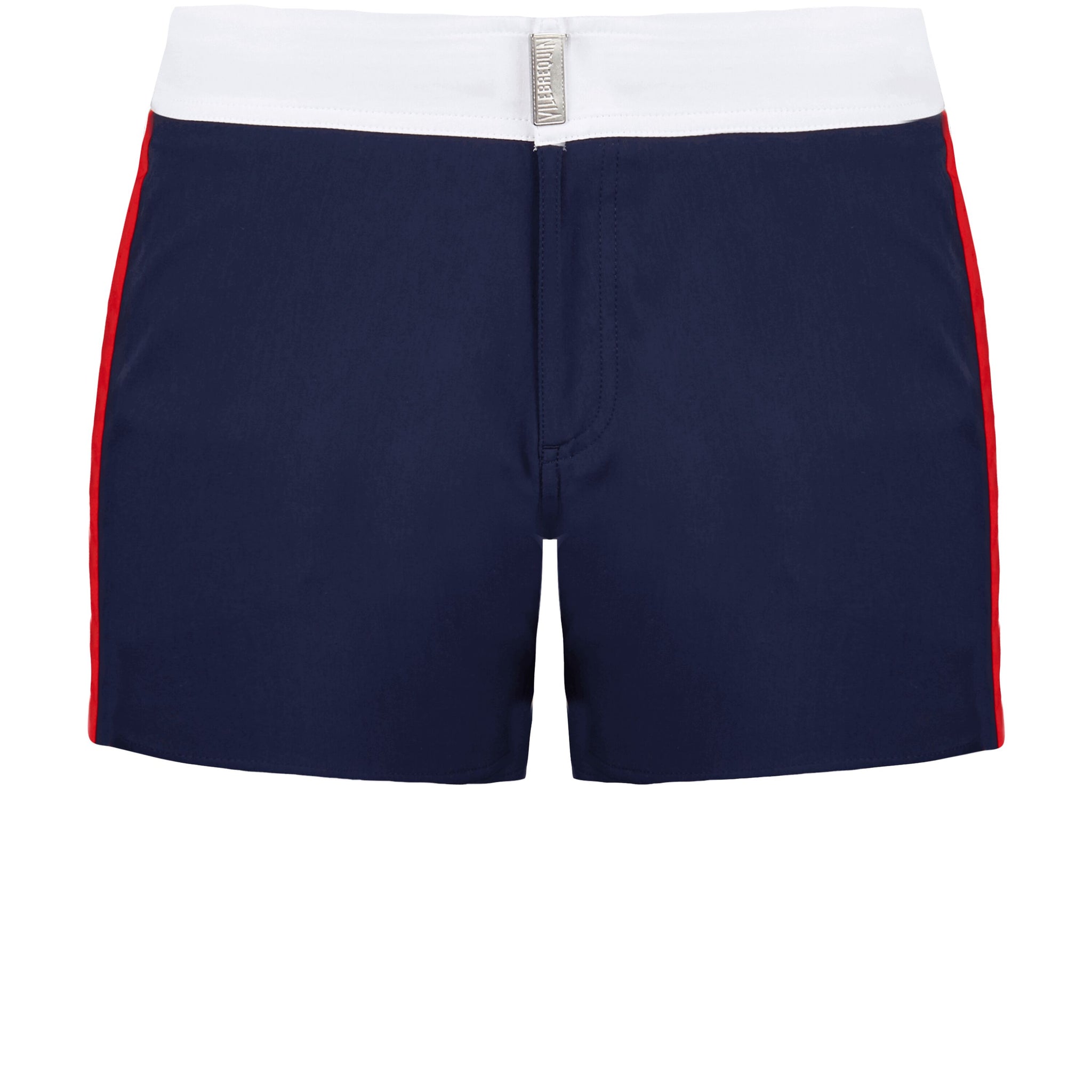 Made from quick-drying stretch fabric, the Merle three-tone men's swim shorts have a contrasting flat waistband, fastened with a rectangular button with the Vilebrequin logo. The bands on the sides highlight the slanted pockets. These swim shorts also feature a back pocket with Velcro fastening.