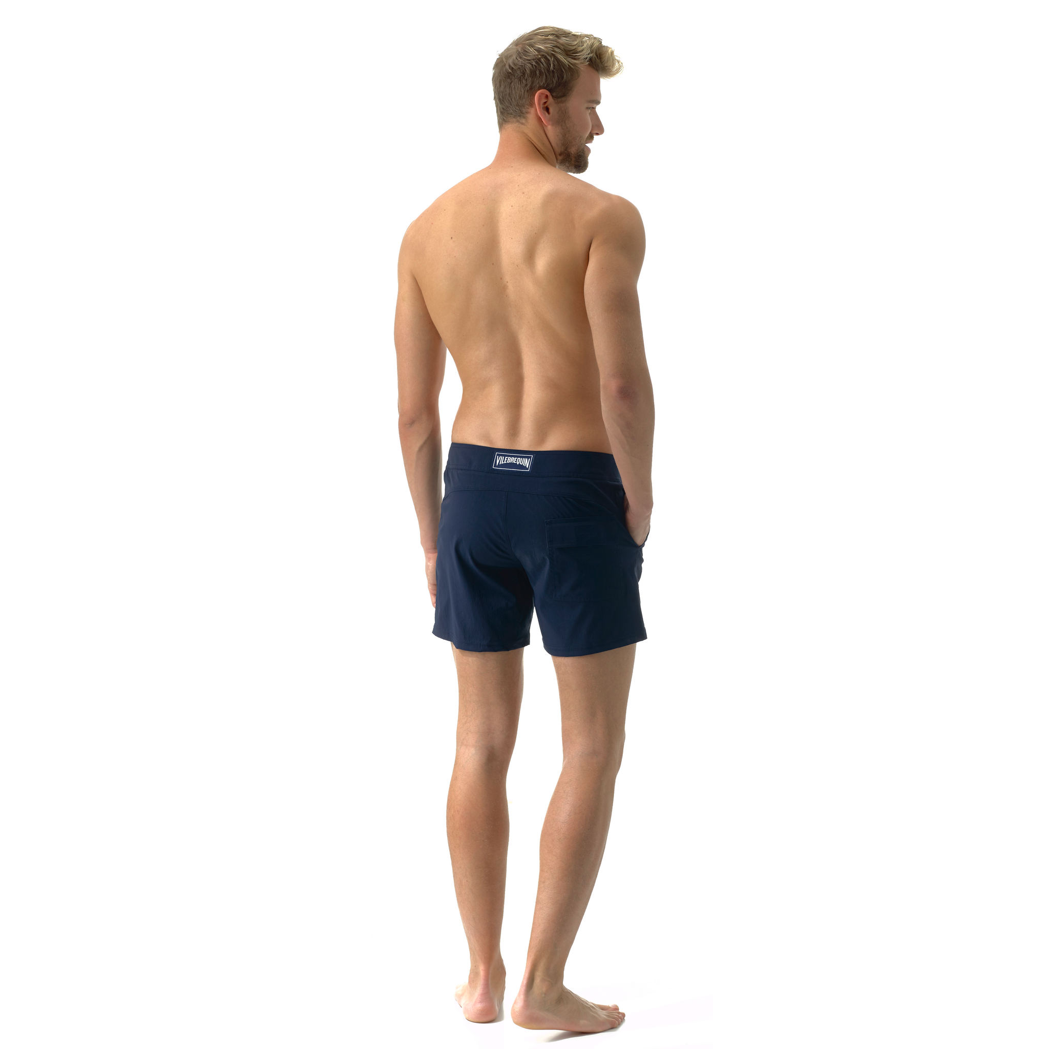 With ingenious back seaming for a bodyshaping effect, these Merise plain men's short swim trunks are made from comfortable stretch fabric. Their flat waistband is fastened with a smart rectangular press-stud featuring the Vilebrequin logo. They have two slanted pockets on the sides, as well as a back pocket with Velcro fastening.