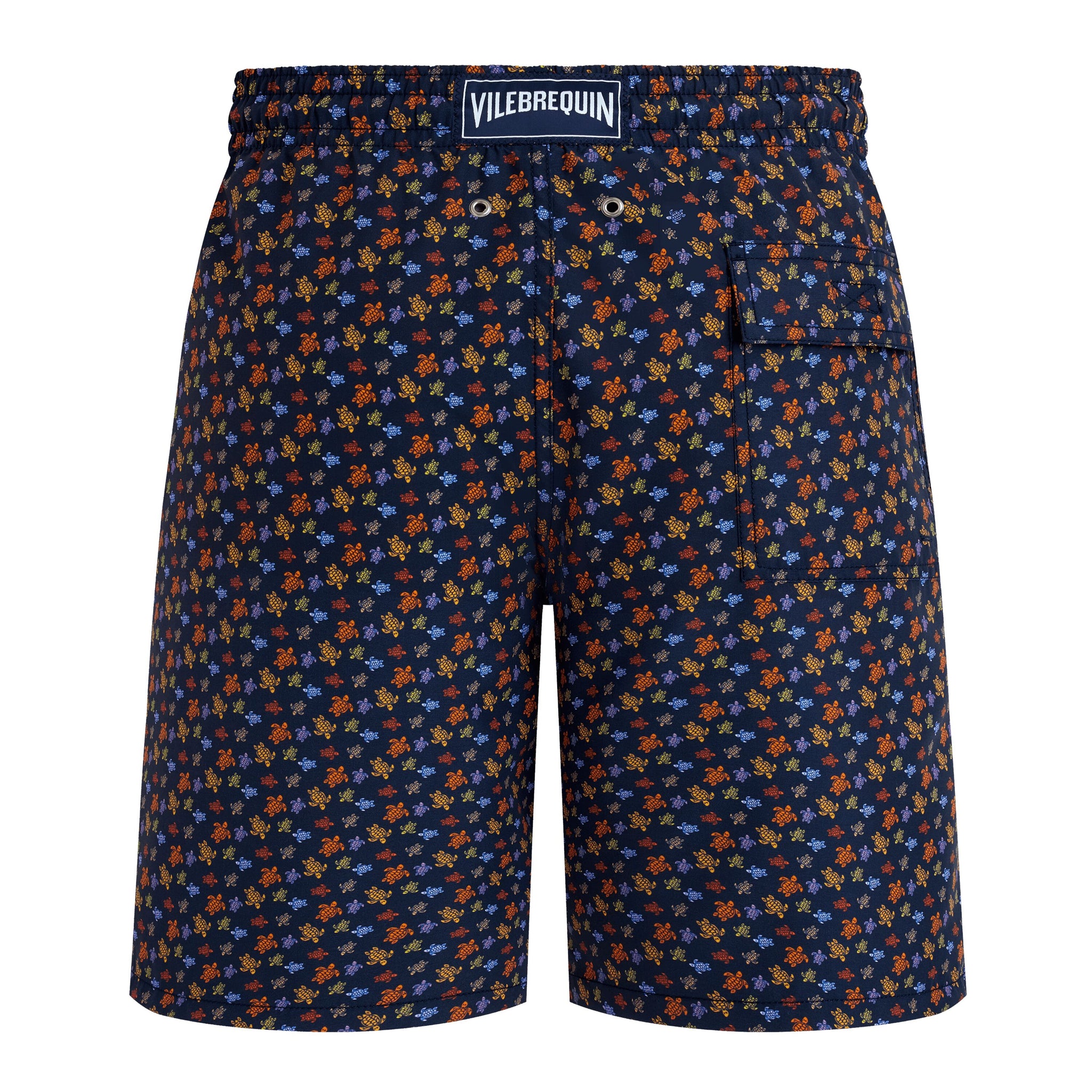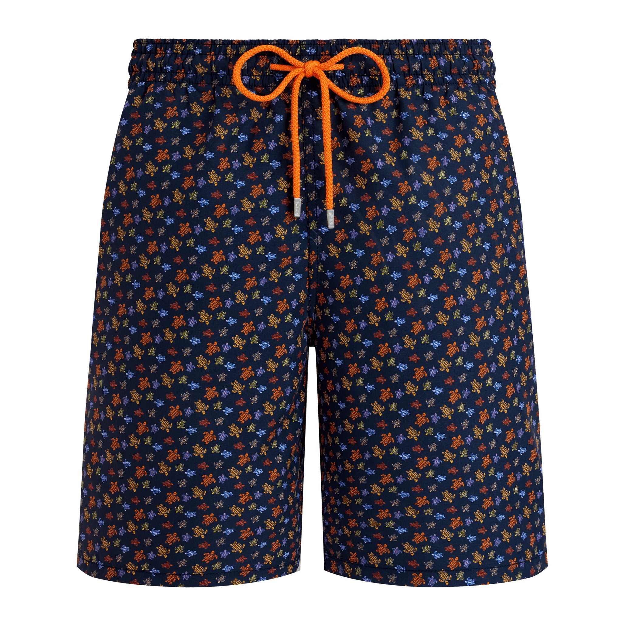 - Long swim trunks with elastic waistband and drawstring with Zamac tips