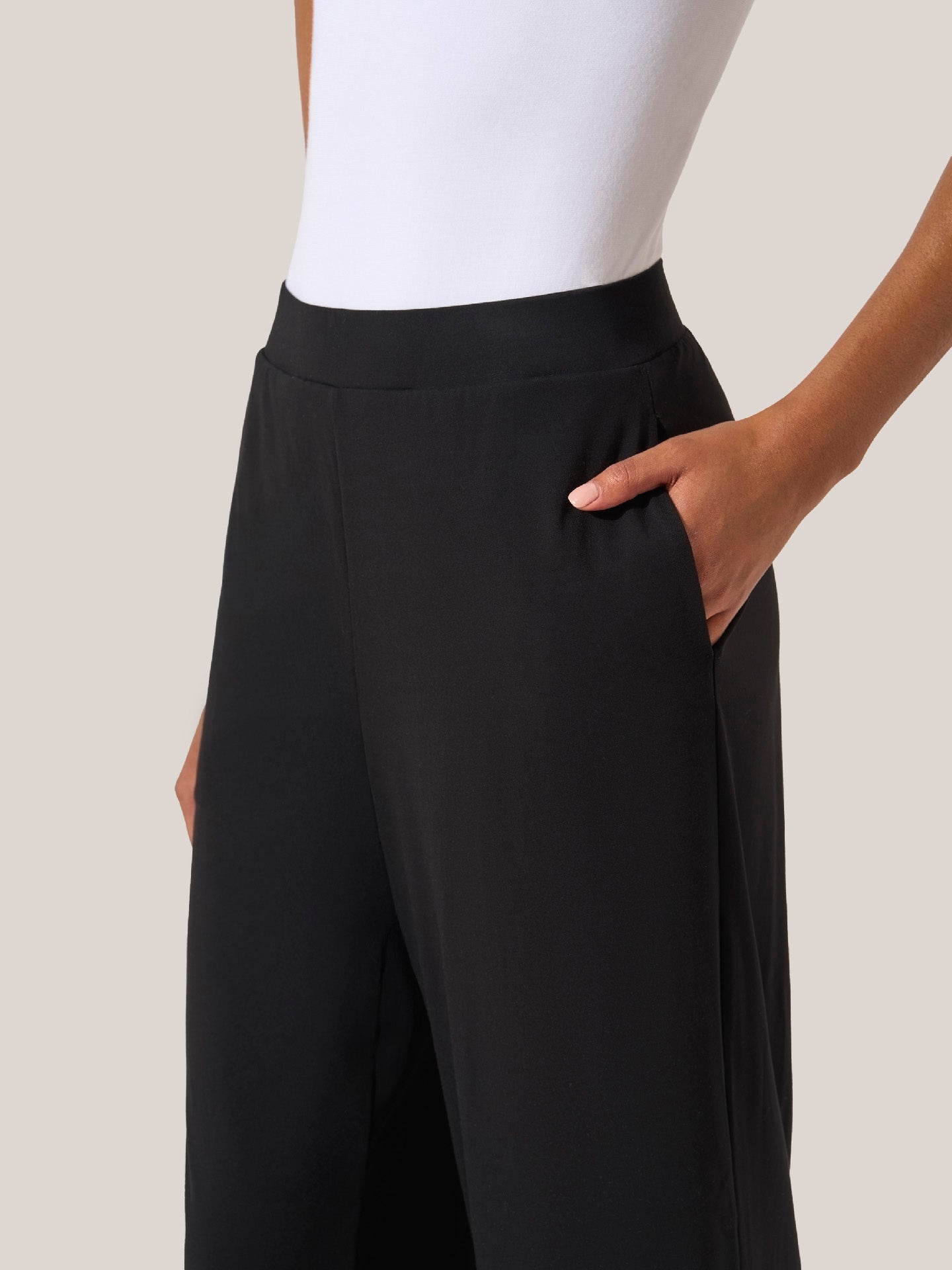 Soft and stretchy Pure material complements the pants' loose, culotte-inspired fit. The wide legs end at the ankle, creating flowing movement with every step. Clean-cut hems complement the minimalist design.