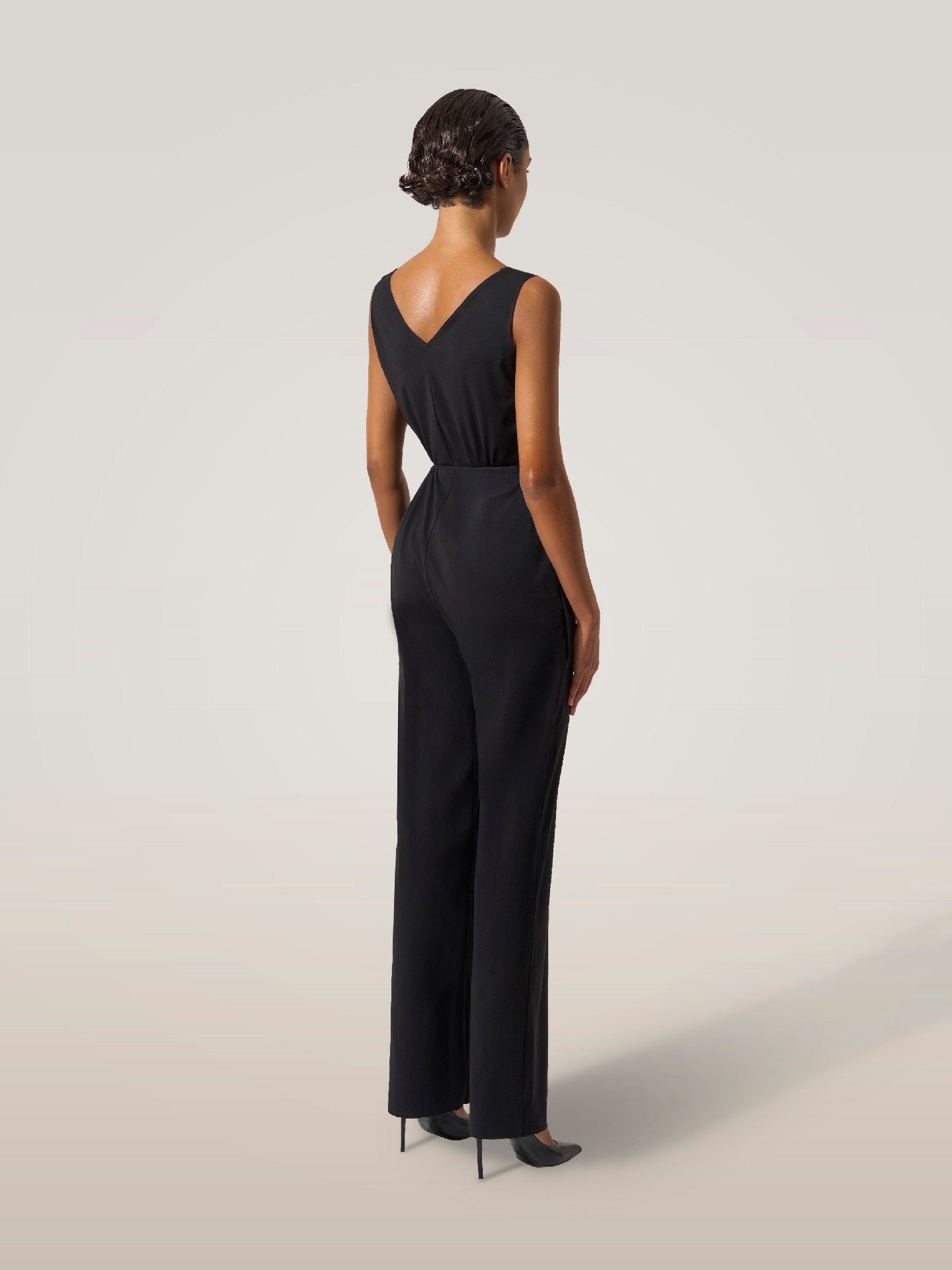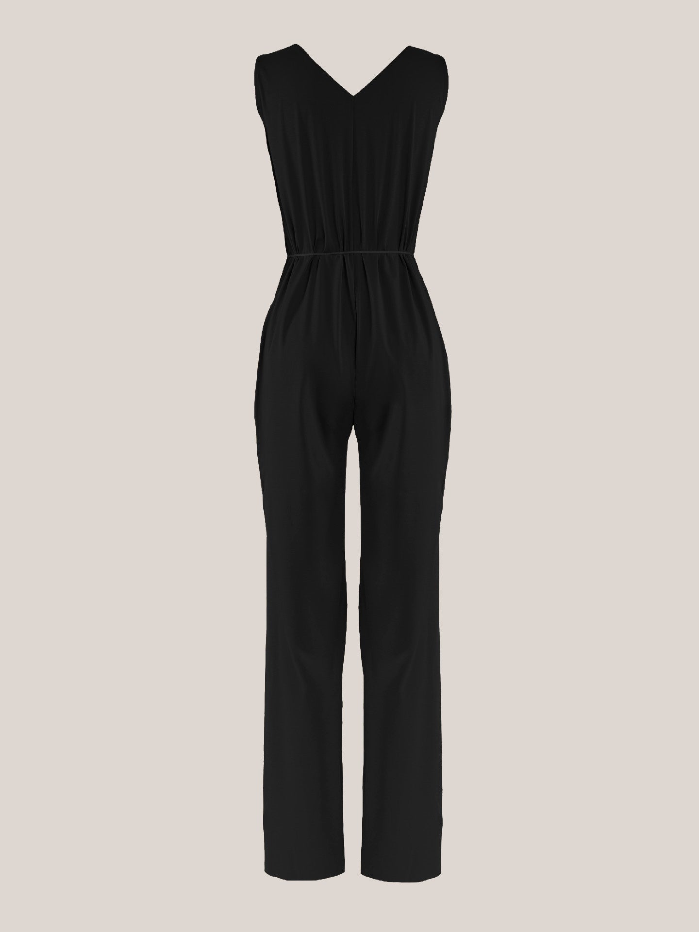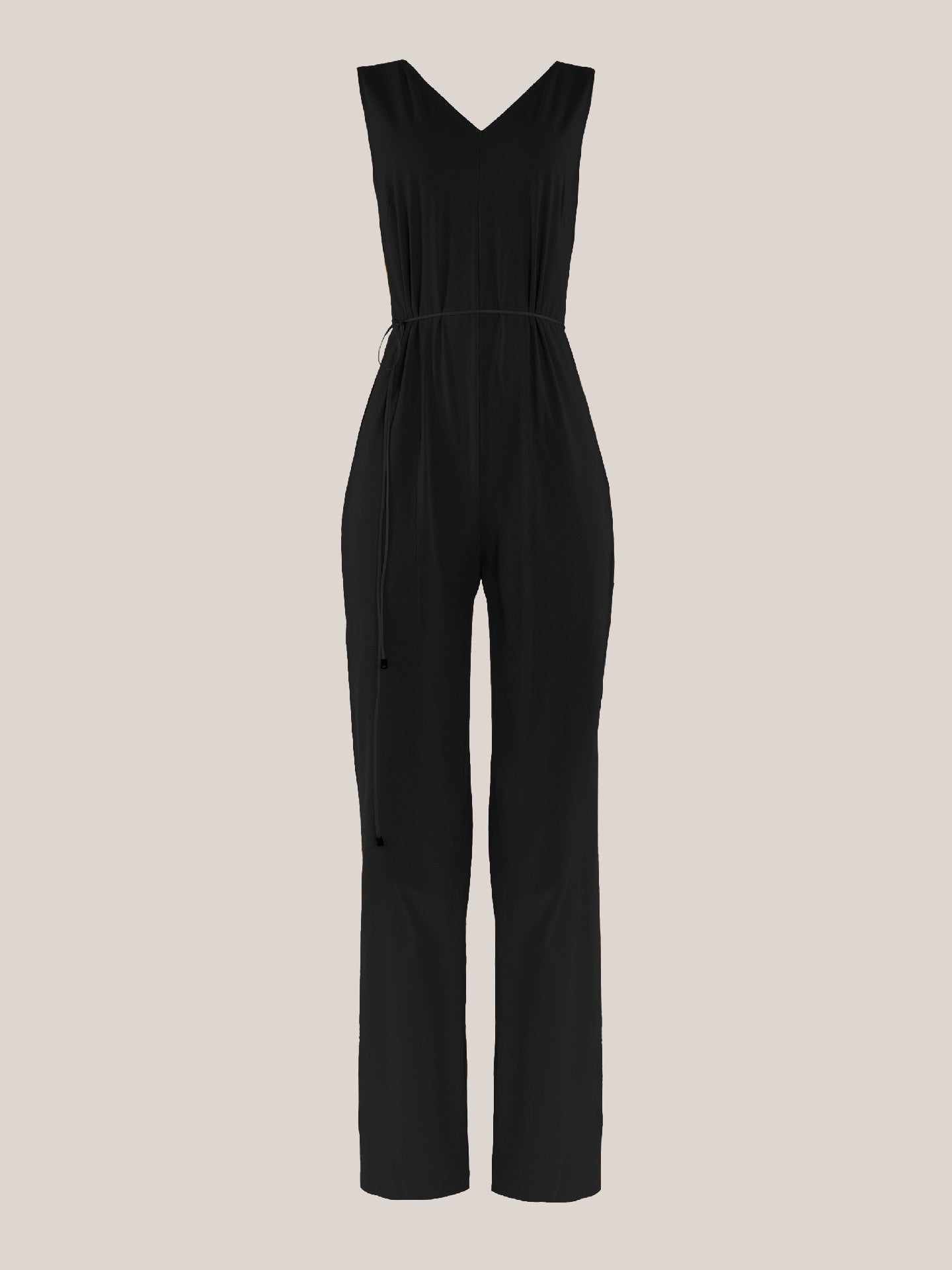 A minimalist approach to elegance, this sleeveless jumpsuit is crafted from a modal and elastane blend ?Çô light, soft, and stretchy, so you'll never want to take it off. It has a streamlined silhouette with a V-neckline and a thin cord belt for extra styling options. The velvety matttexture and raw-cut edges ensure a flawless fit.