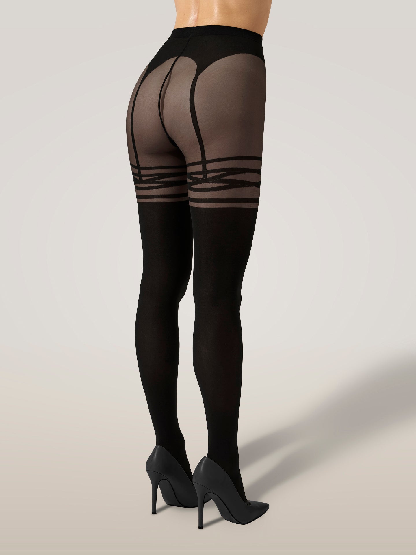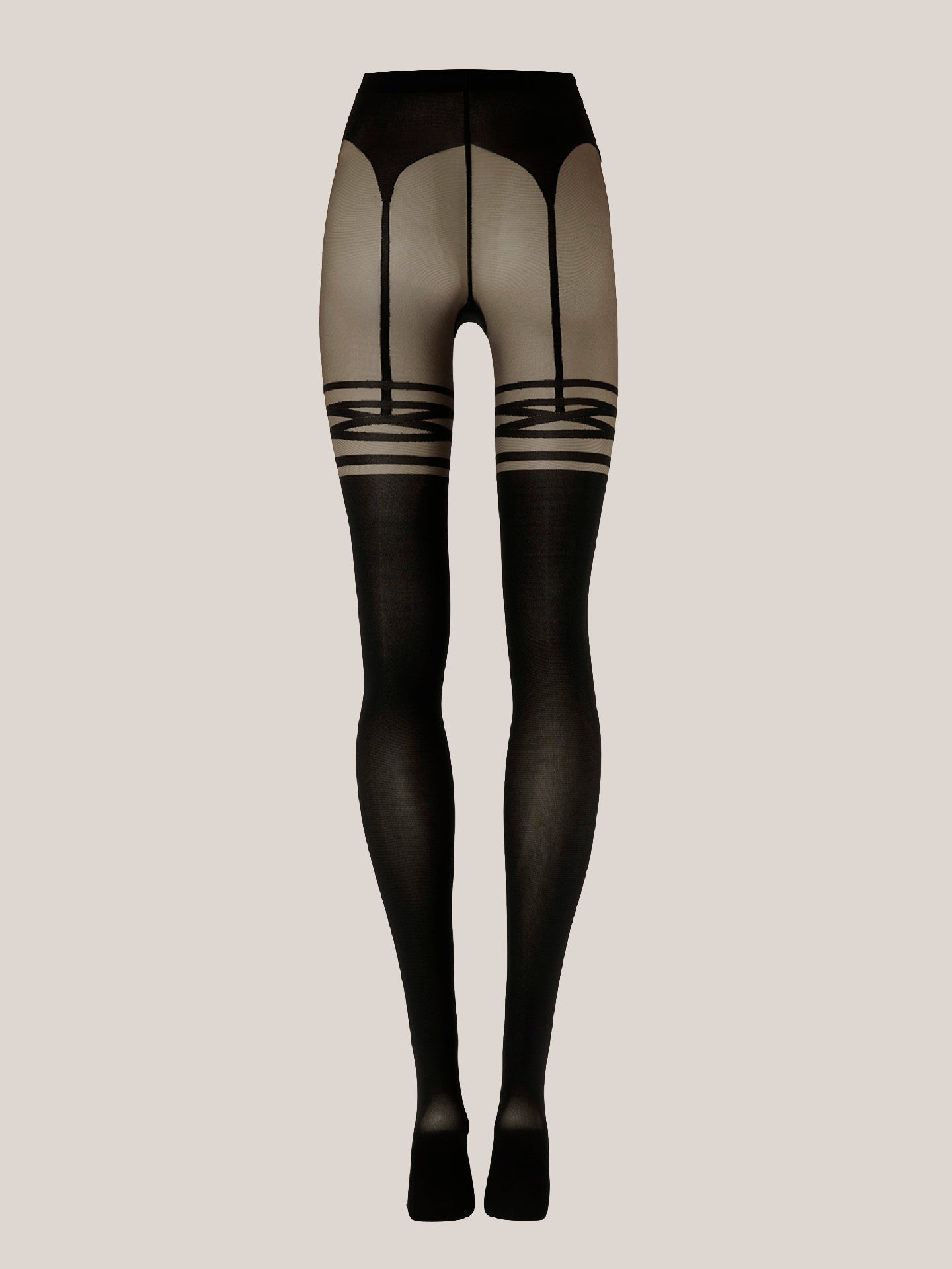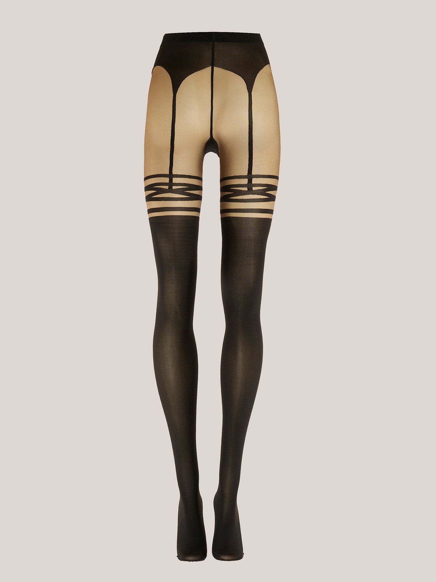 Dress to seduce with these ultra-feminine tights ?Çô designed to create the illusion of stockings paired with a garter belt. The unique motif expertly enhances your curves, while the irresistible texture mixing sheer and opaque effects takes the look to the next level. They're crafted using the circular knitting technique, sustainably dyed, and treated for a velvety matt finish. The soft, knitted waistband ensures a perfect fit.