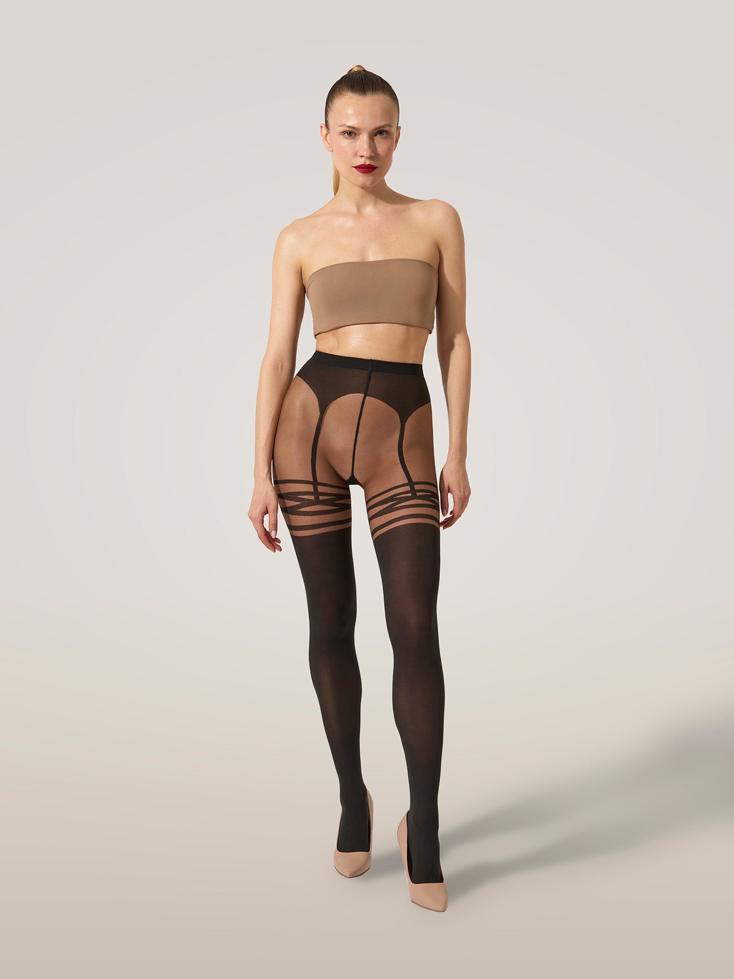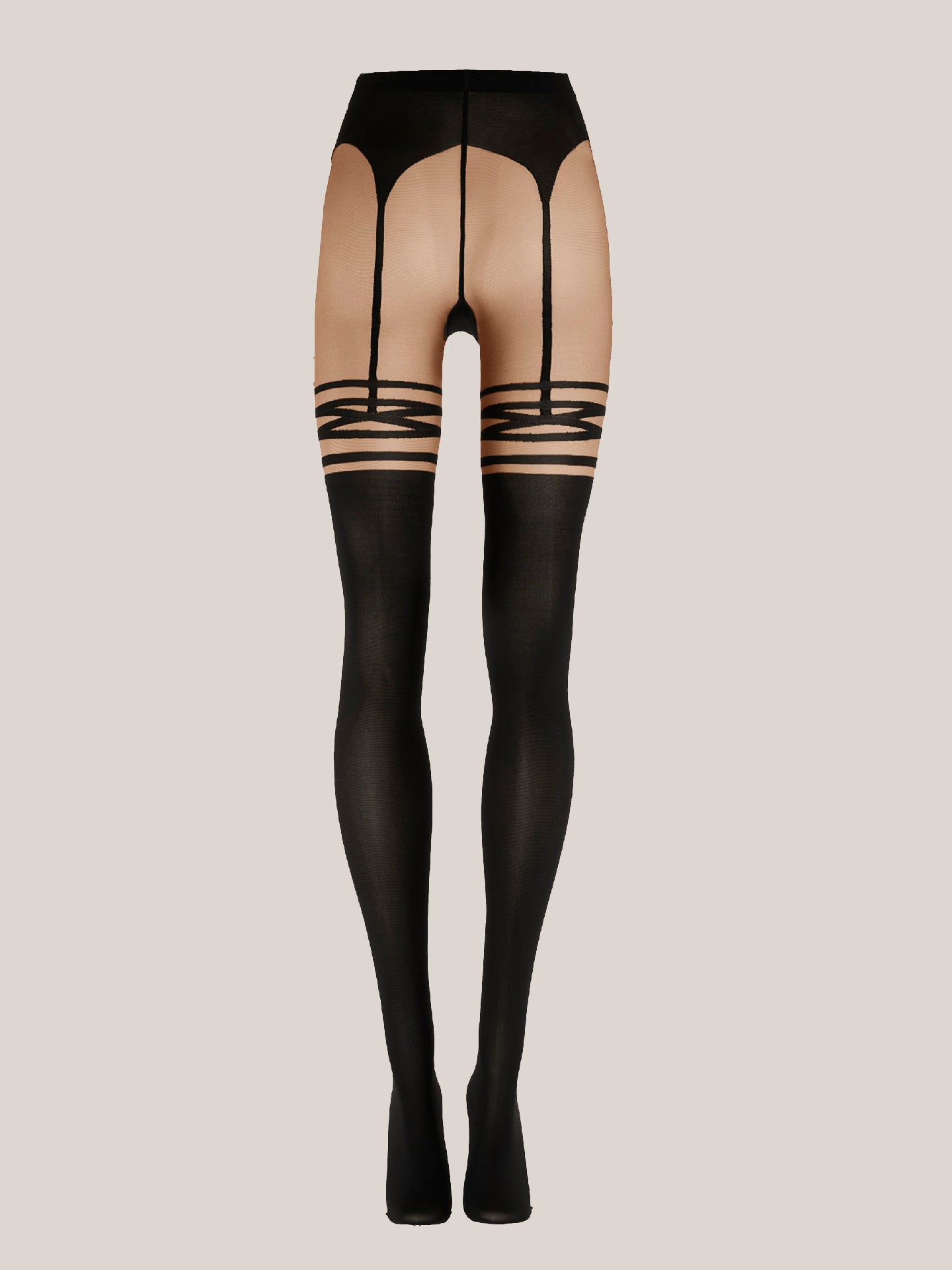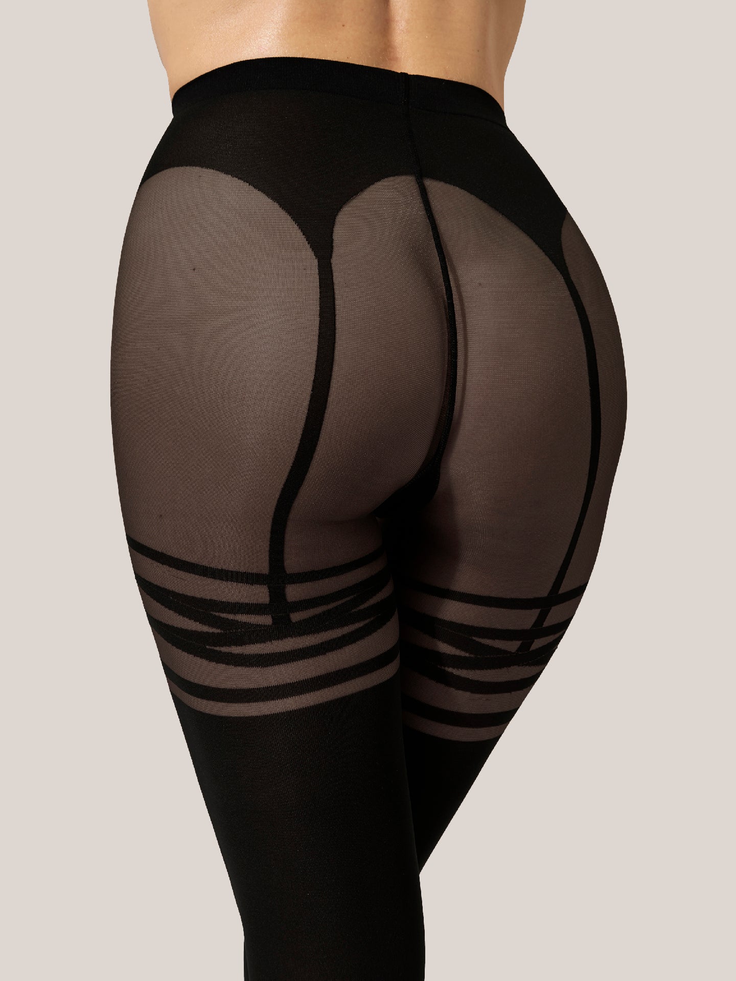 Dress to seduce with these ultra-feminine tights ?Çô designed to create the illusion of stockings paired with a garter belt. The unique motif expertly enhances your curves, while the irresistible texture mixing sheer and opaque effects takes the look to the next level. They're crafted using the circular knitting technique, sustainably dyed, and treated for a velvety matt finish. The soft, knitted waistband ensures a perfect fit.