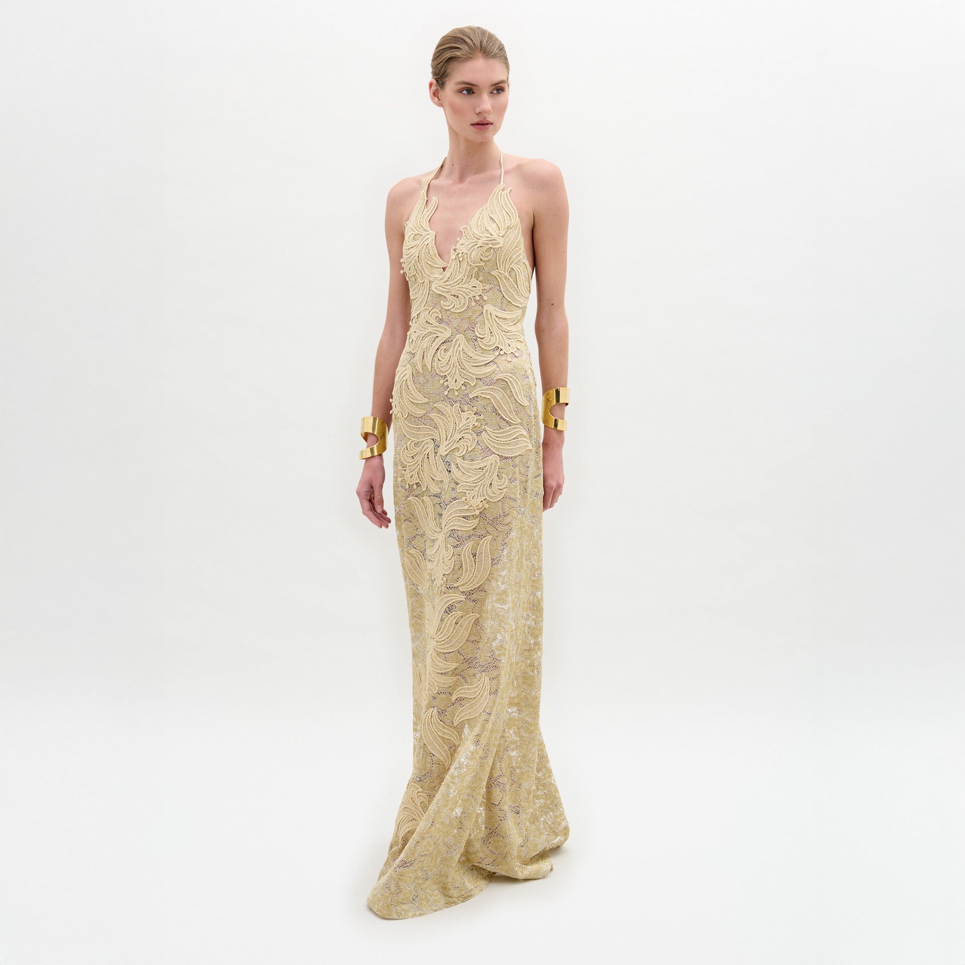 A woman wears the Aurora Dress—floor-length, sleeveless, crafted from gold lace with a fitted silhouette and wavy patterns—paired with gold cuff bracelets, standing against a plain white background.