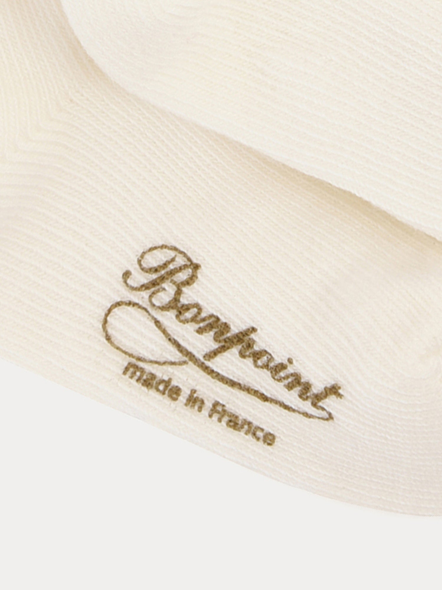 These ecru socks are very delicate. With their narrow ribbing and folded-down section at the top, they keep baby's feet warm while adding the perfect finishing touch to the outfit. Pair them with leather Mary Janes for an adorable combination.