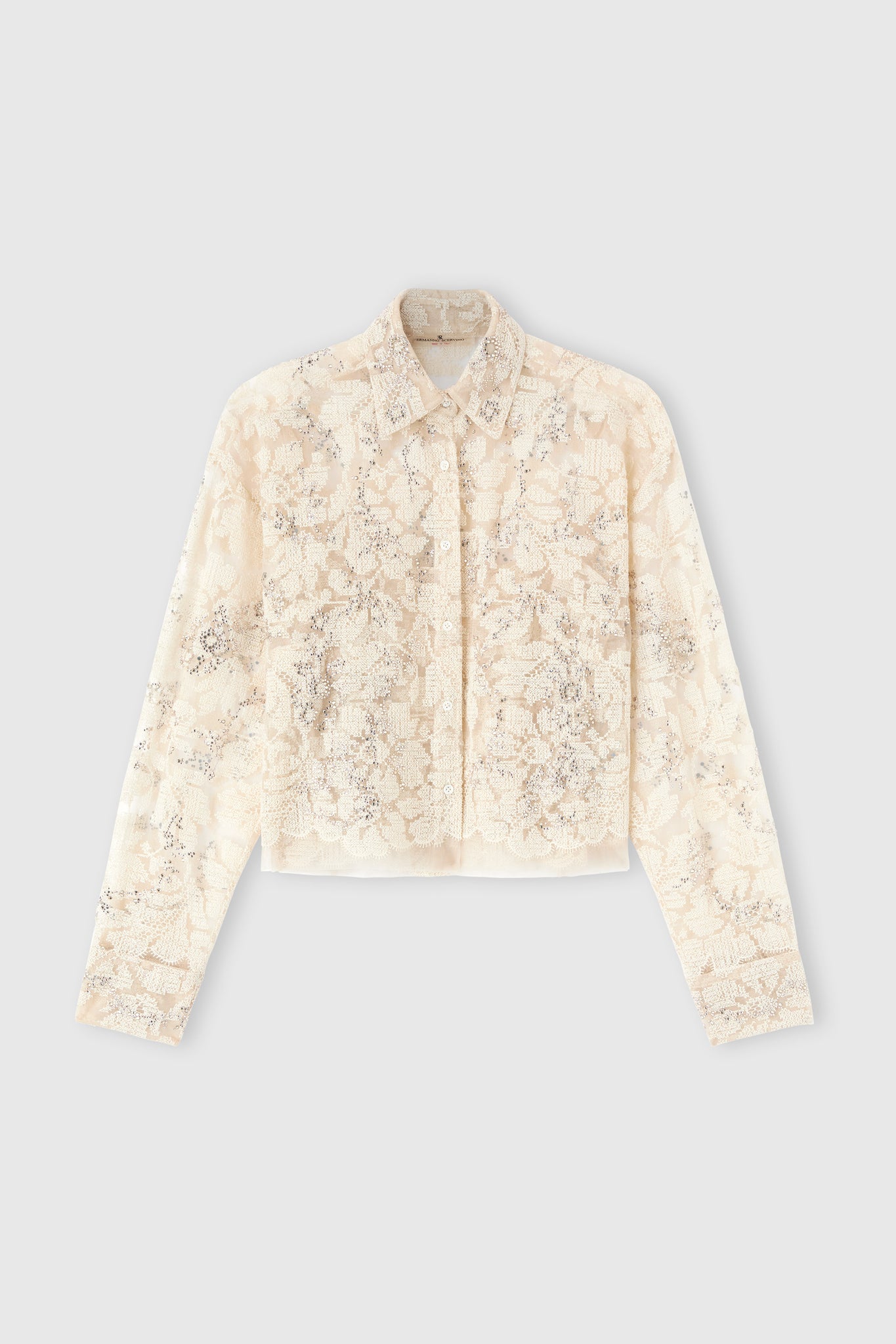 Ethereal elegance takes shape in this boxy-cut shirt with defined lines, entirely crafted from the collection’s new exclusive lace by Ermanno Scervino. The delicate floral design, created using the petit point technique, traces a precious and airy pattern across the body, where sheer and opaque elements alternate in a refined play of transparency. To illuminate the piece, small crystals are hand-applied like drops of dew, adding soft, sophisticated highlights.