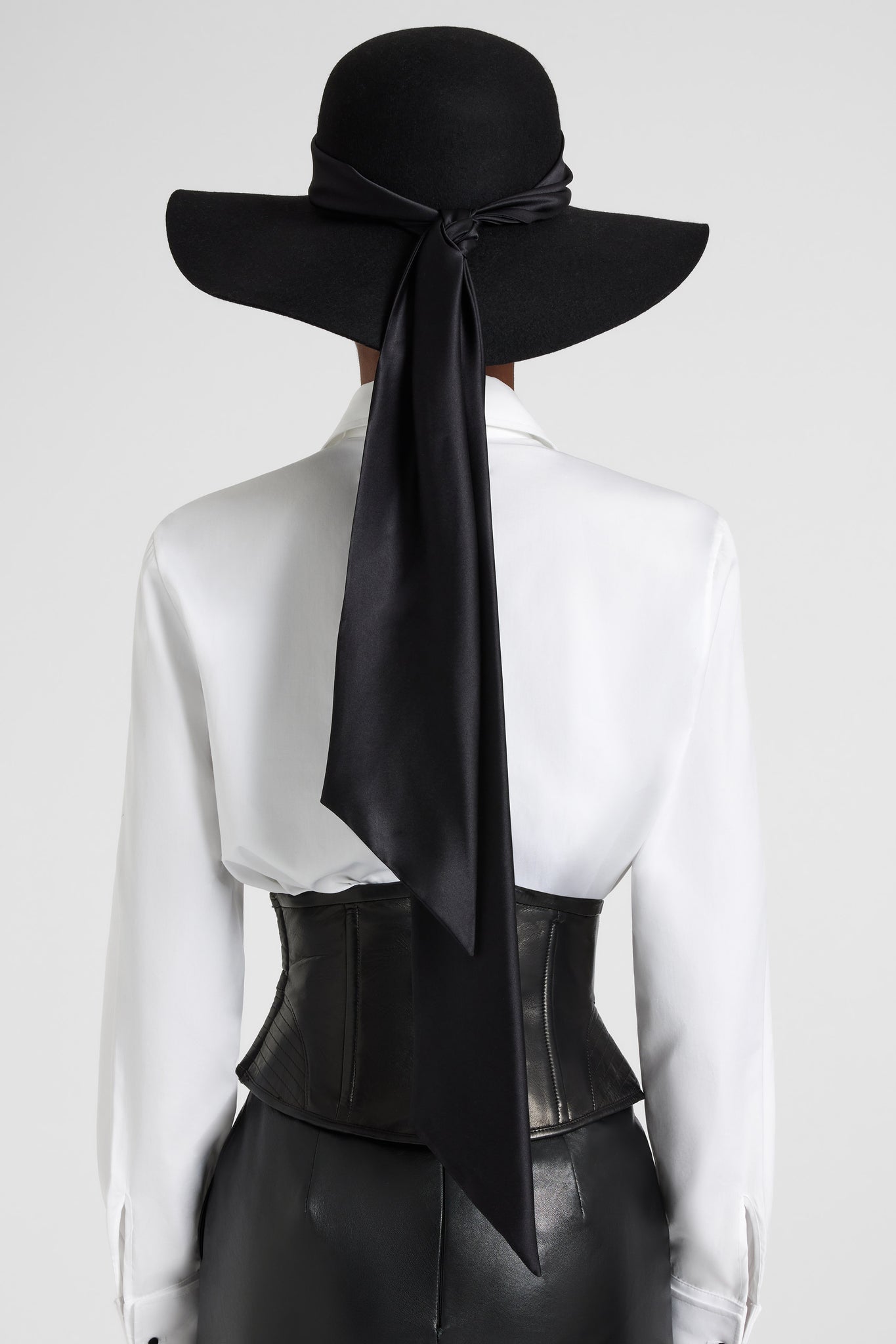Defined by wide, refined lines, the Dudu hat is an iconic accessory with essential elegance. Made from compact and lightweight wool felt, it features a soft, velvety finish that enhances its tactile appeal. The wide-brimmed silhouette gracefully framesThe face, adding a sophisticated and confident touch to any look.