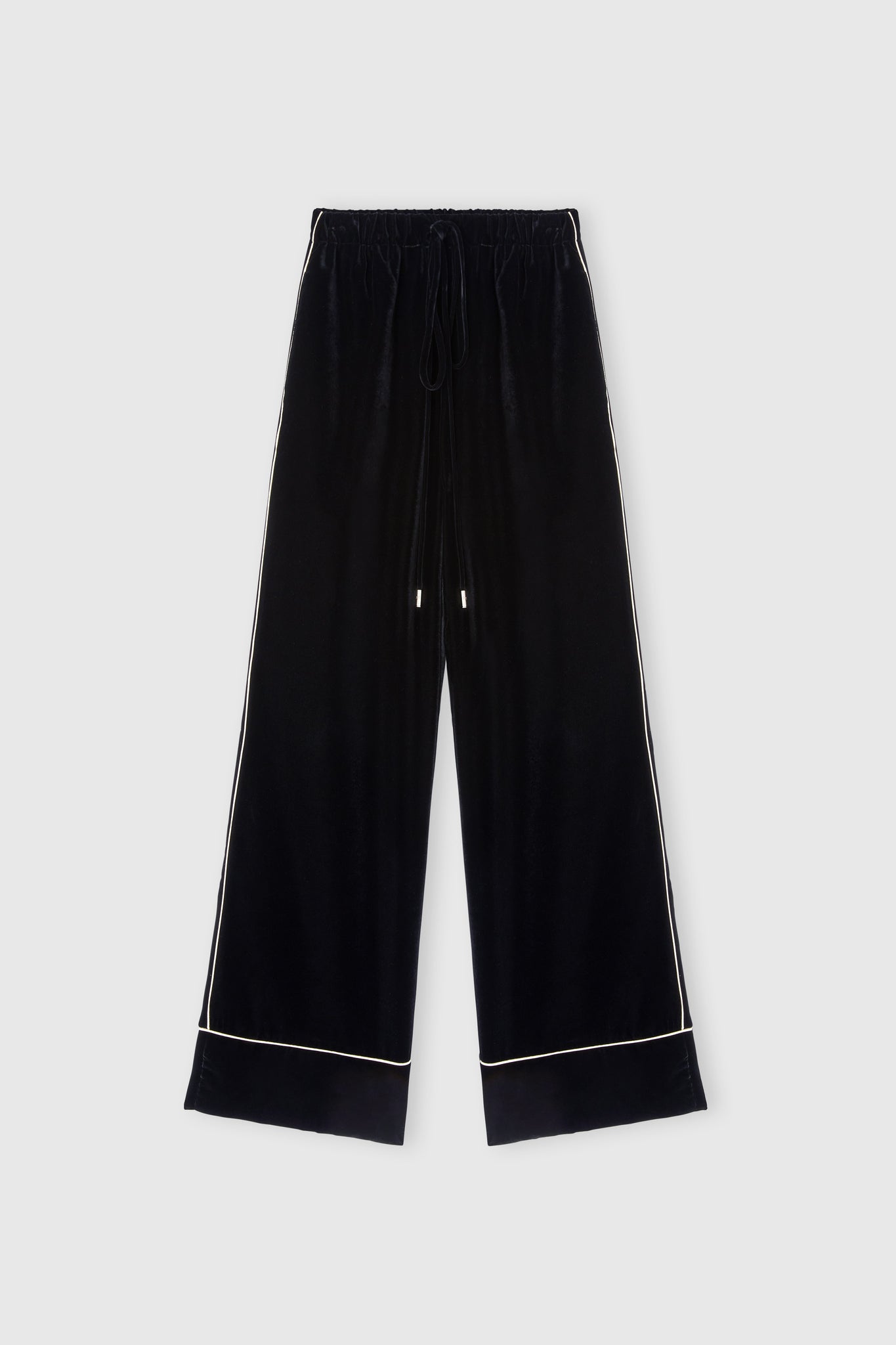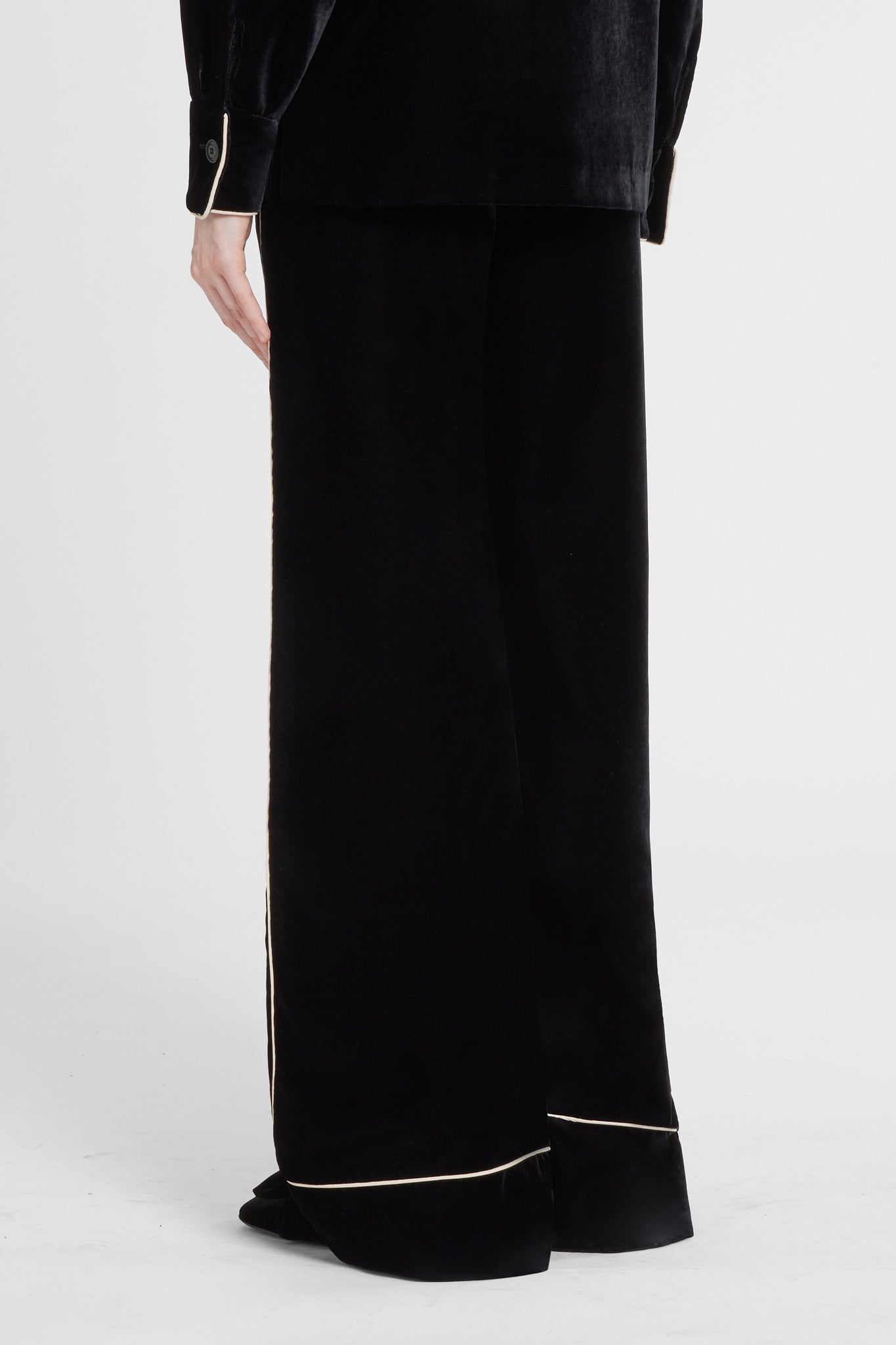Relaxed elegance takes center stage in these velvet palazzo pants, crafted from viscose and silk. Inspired by the refined codes of classic loungewear, the white contrast piping at the hems and side seams nods to traditional pajamas, reimagined with Ermanno Scervino’s unmistakable sophistication.