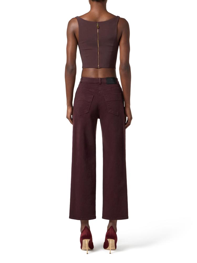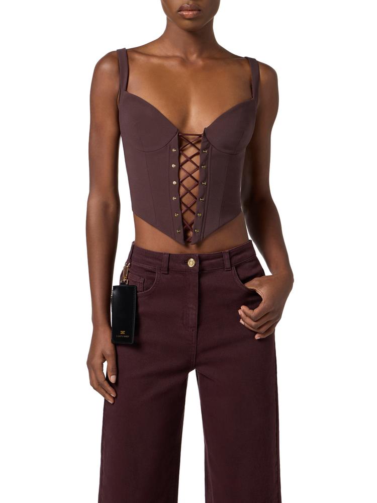 Top in bi-elastic fabric with slim fit. It is characterised by a bustier construction with a pointed cut that sculpts the silhouette. The criss-cross laces at the front are framed by golden metal buttons for a touch of light.
